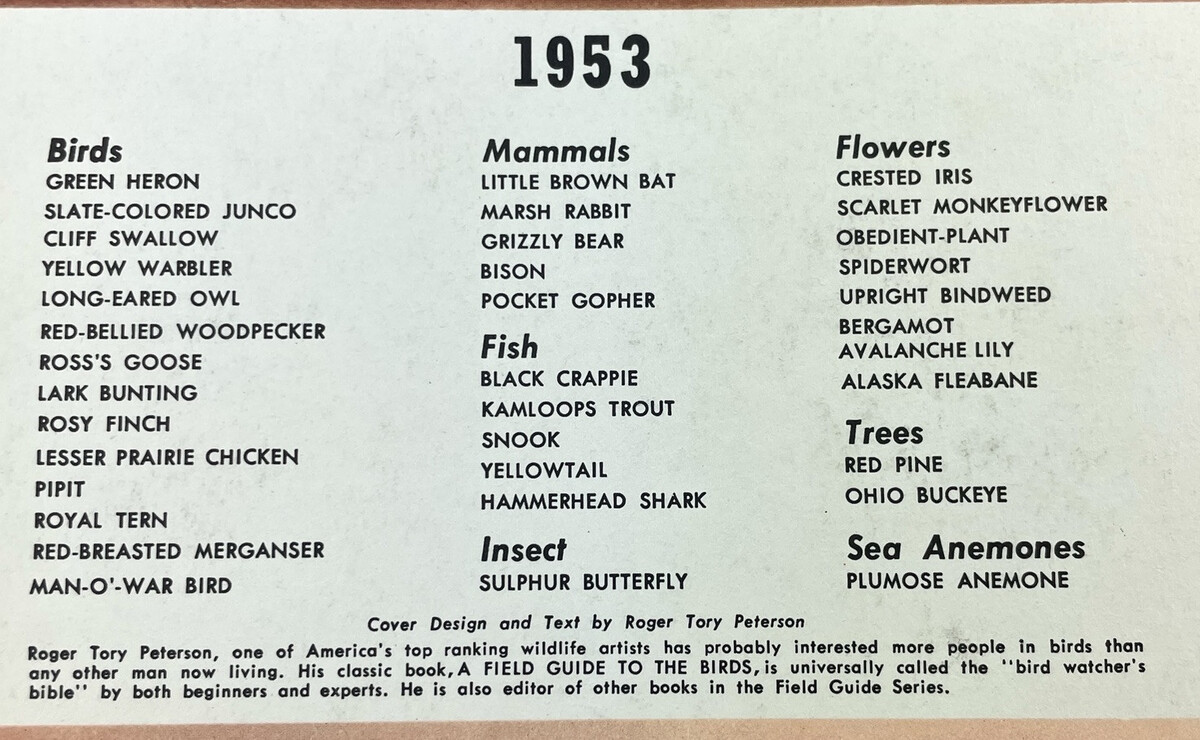 Has places for 36 wildlife stamps including birds, mammals, fish, insect, flowers, trees and sea anemones.