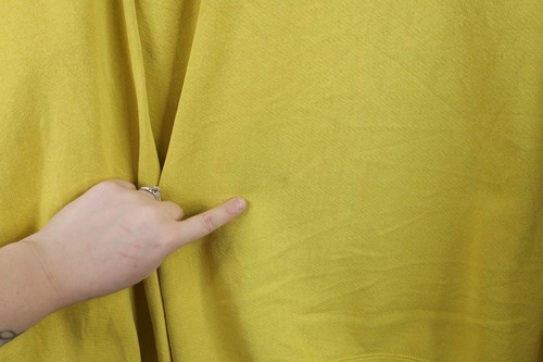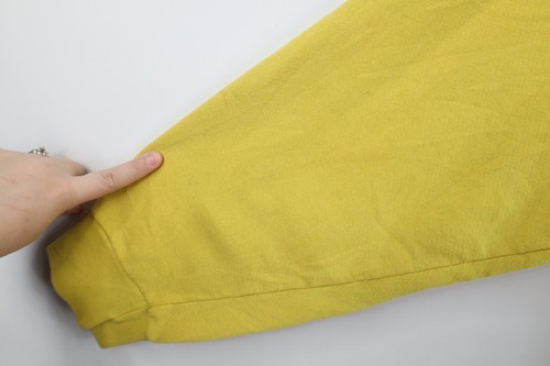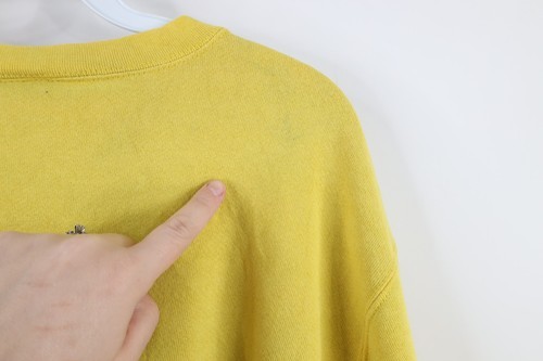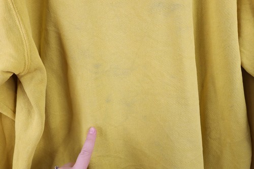 Stains front middle and right, both arms, back. Color faded
