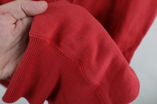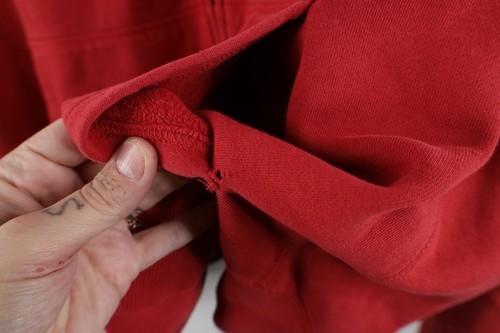 Dark spots/blemishes throughout. Hole pocket corners, collar. Design, string distressed. Hood, cuffs discolored. Color faded. Pilling