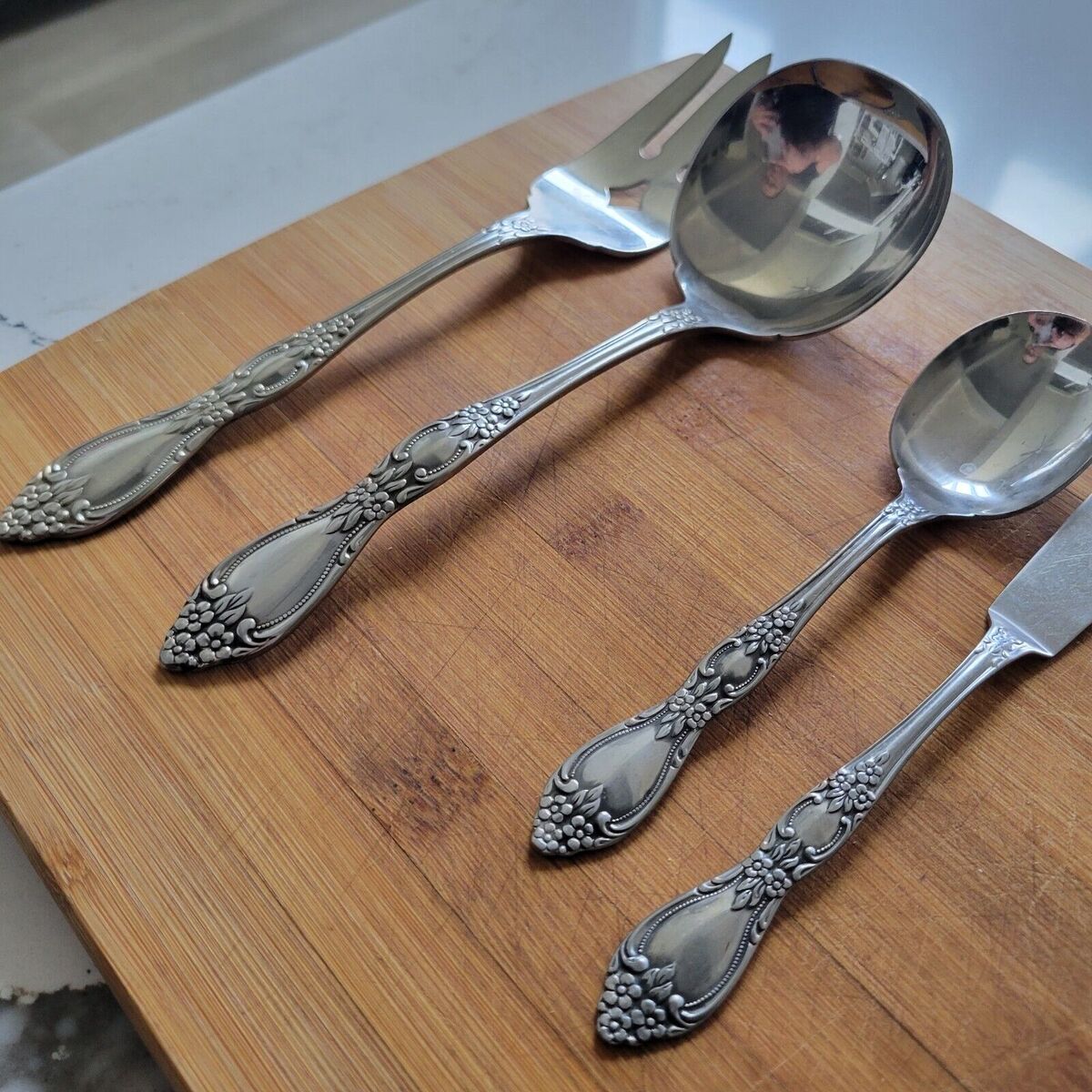 The set is in great shape and has been well taken care of. It is perfect for anyone who wants to add a touch of class to their dining experience. Whether you're hosting a dinner party or just enjoying a family meal, this Vintage Oneida by Rogers Stainless Steel Set of 4 Serving Set is sure to impress.