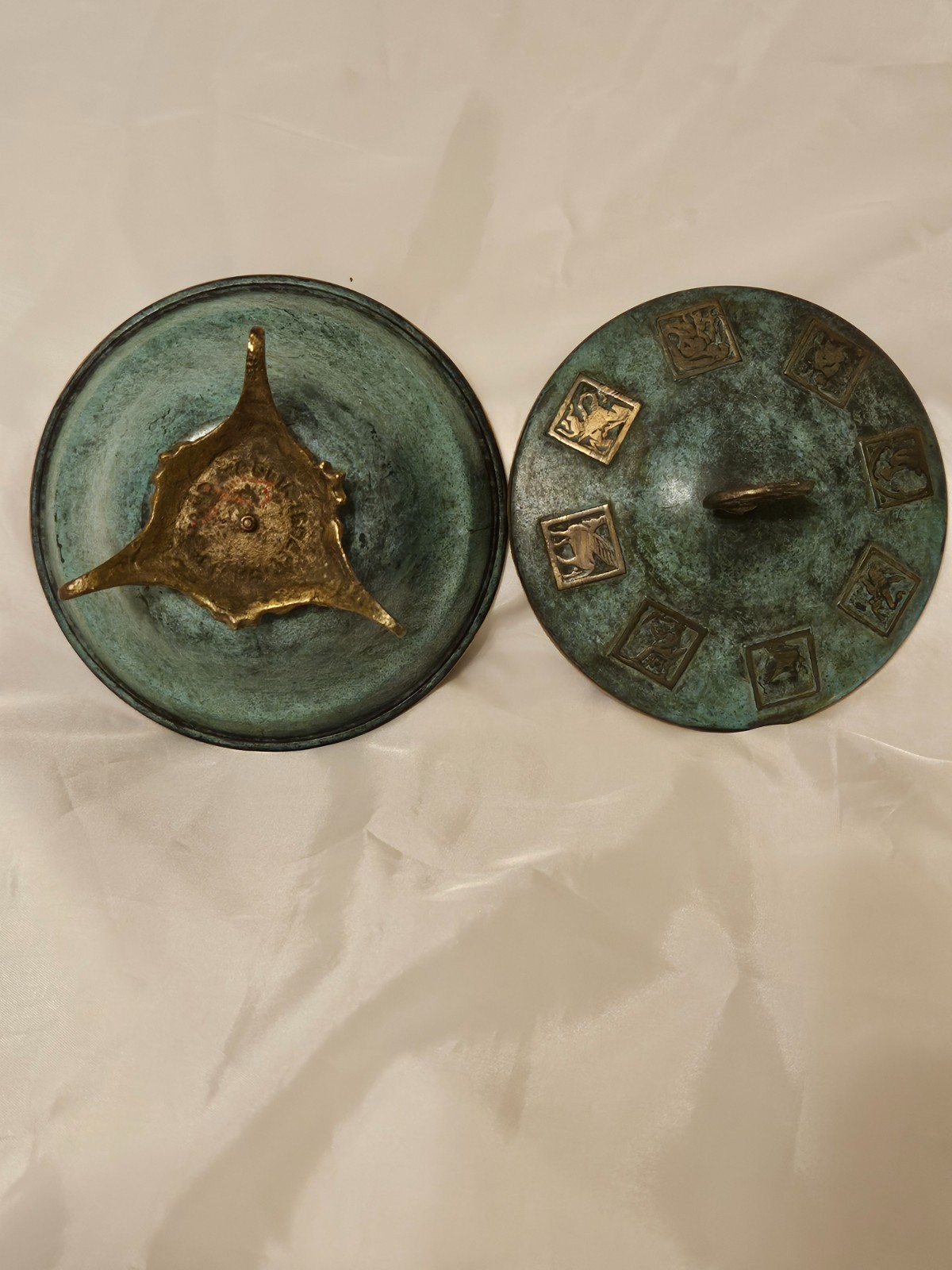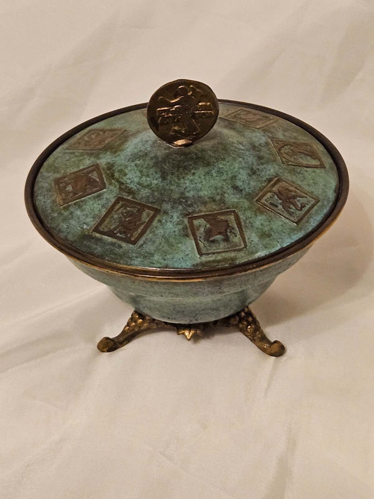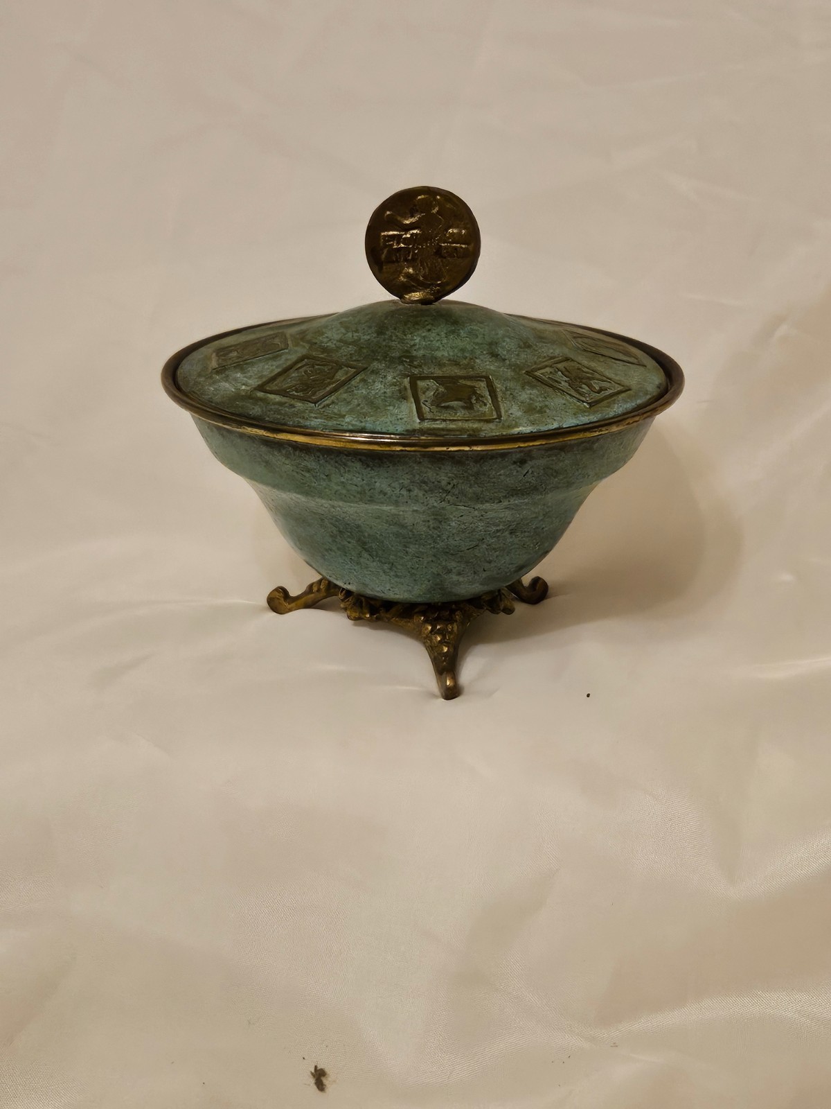 - Vintage Oppenheim Israel Brass Verdigris Enamel Covered Sugar/Candy Bowl