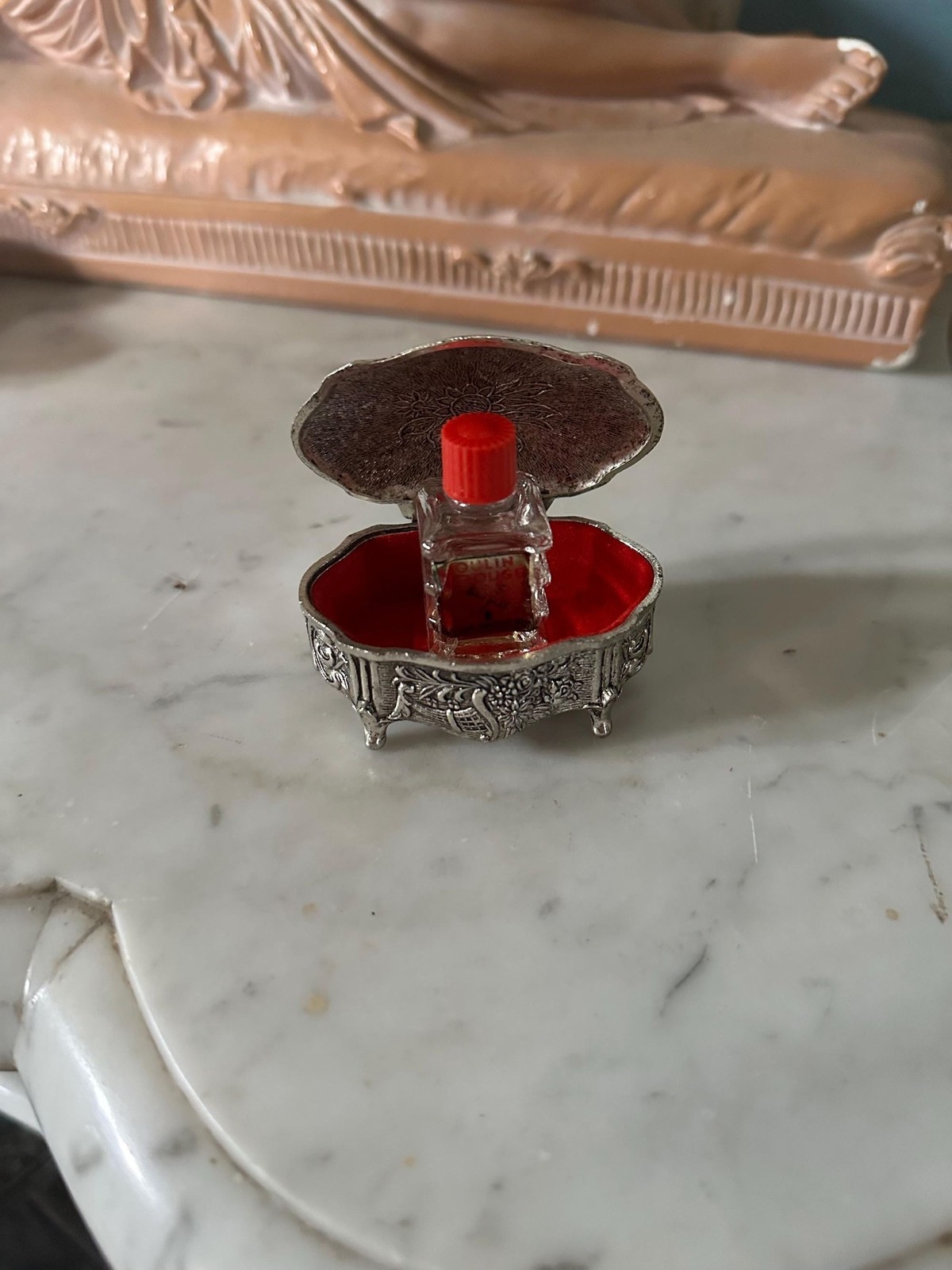 What a remarkable find! The vintage French perfume holder box you have is an exceptional piece of history, blending artistry and craftsmanship from a bygone era. The fact that it still houses the original perfume bottle, with even a bit of the fragrance remaining, makes it even rarer and more valuable. It?s like holding a piece of time itself?imbued with the elegance and charm of vintage France. The box and bottle together tell a story of luxury, refinement, and an almost lost tradition, making it an incredibly special treasure.