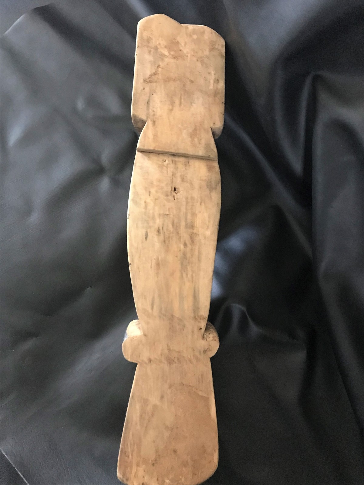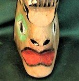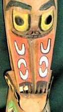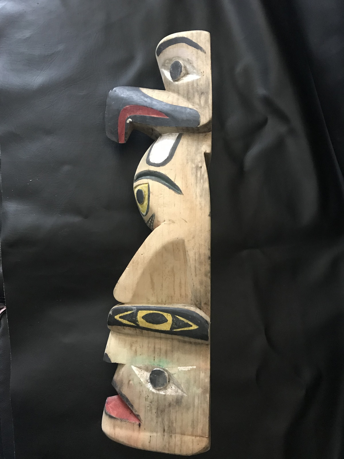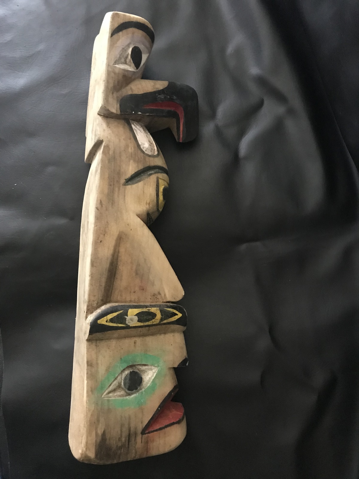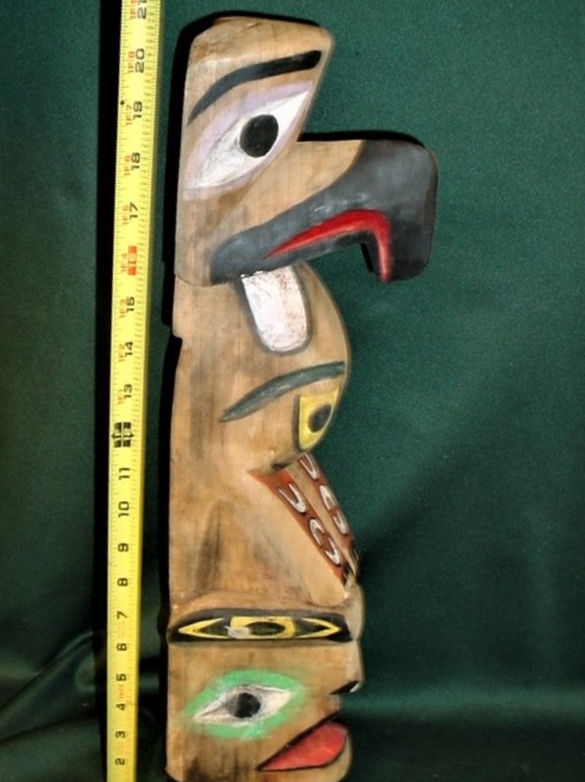 If you're looking to own an incredible piece of Northwestern Native American art that is a one of a kind of object, this beautiful house totem pole may be for you. This piece is 21 inches tall and at its widest it is 4 1/4 inches.