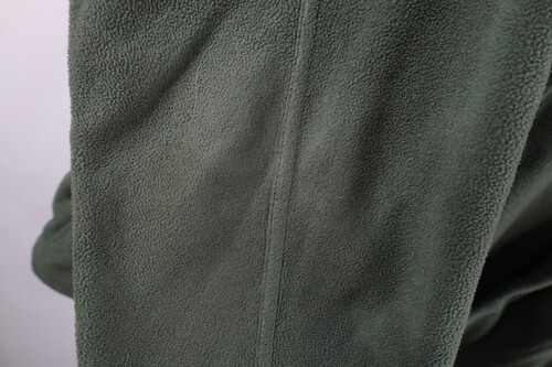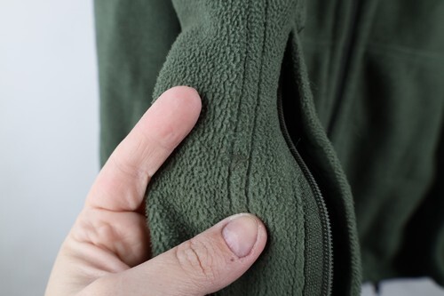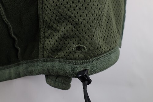 Has hair stuck in the fleece. Stains front, right arm. Blemishes back top. Elbows worn. Color faded
