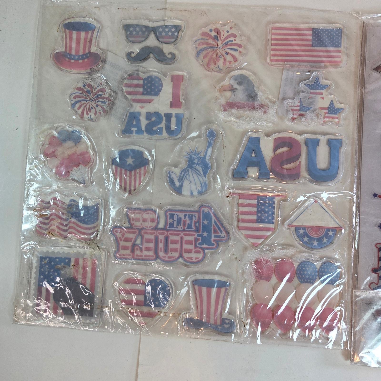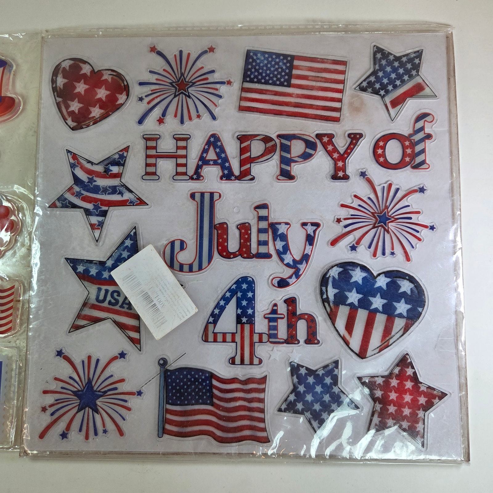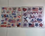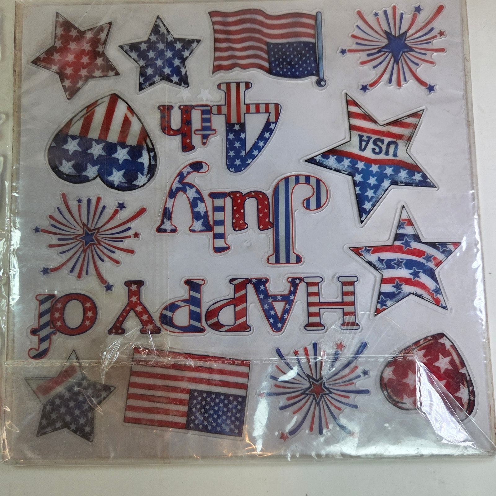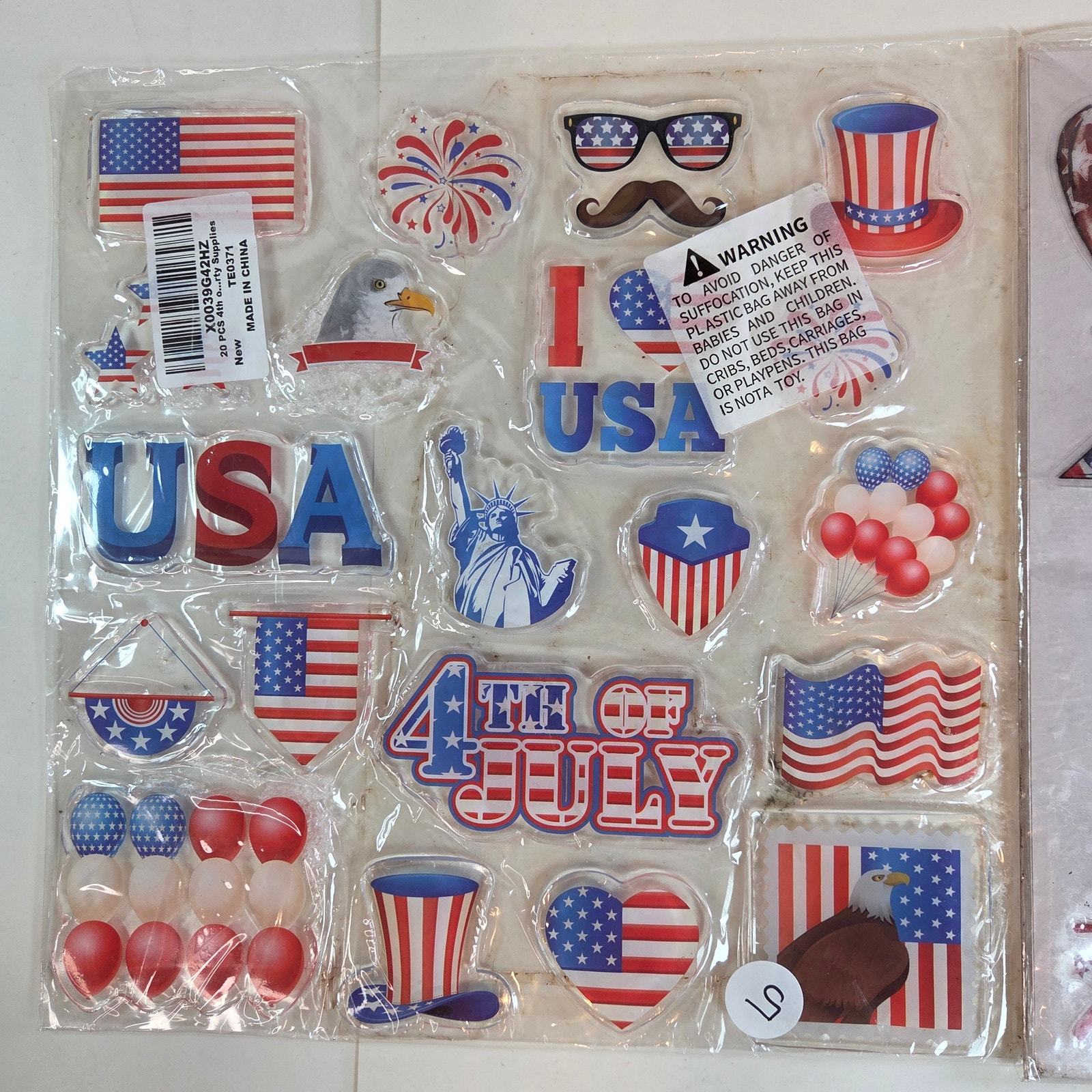 Celebrate in red, white, and blue style with this lot of two different patriotic sticker packs. One is a thick ?gel? style window cling set featuring USA flags, hearts, balloons, stars, and festive icons. The other contains multiple sheets (sealed) of vinyl-style window clings with ?Happy 4th of July? lettering, fireworks, stars, and more. These are ideal for decorating windows, mirrors, or smooth surfaces for Independence Day or other patriotic holidays.
