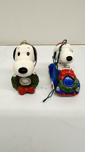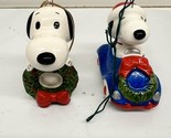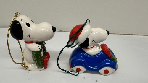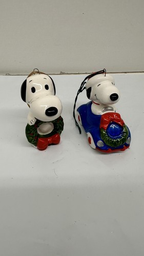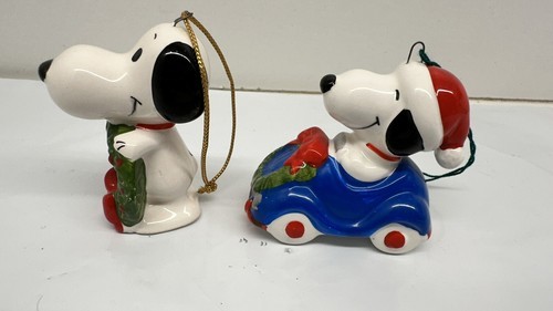 - Vintage Peanuts Ceramic Snoopy In Car And Wreath Christmas Ornaments Lot Of 2