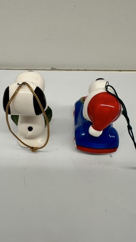 This lot of 2 vintage Peanuts ceramic ornaments features Snoopy in a car and a wreath, making them the perfect addition to any holiday decor. The charming design of these ornaments showcases the beloved character in his signature style, making them a must-have for any Peanuts fan.