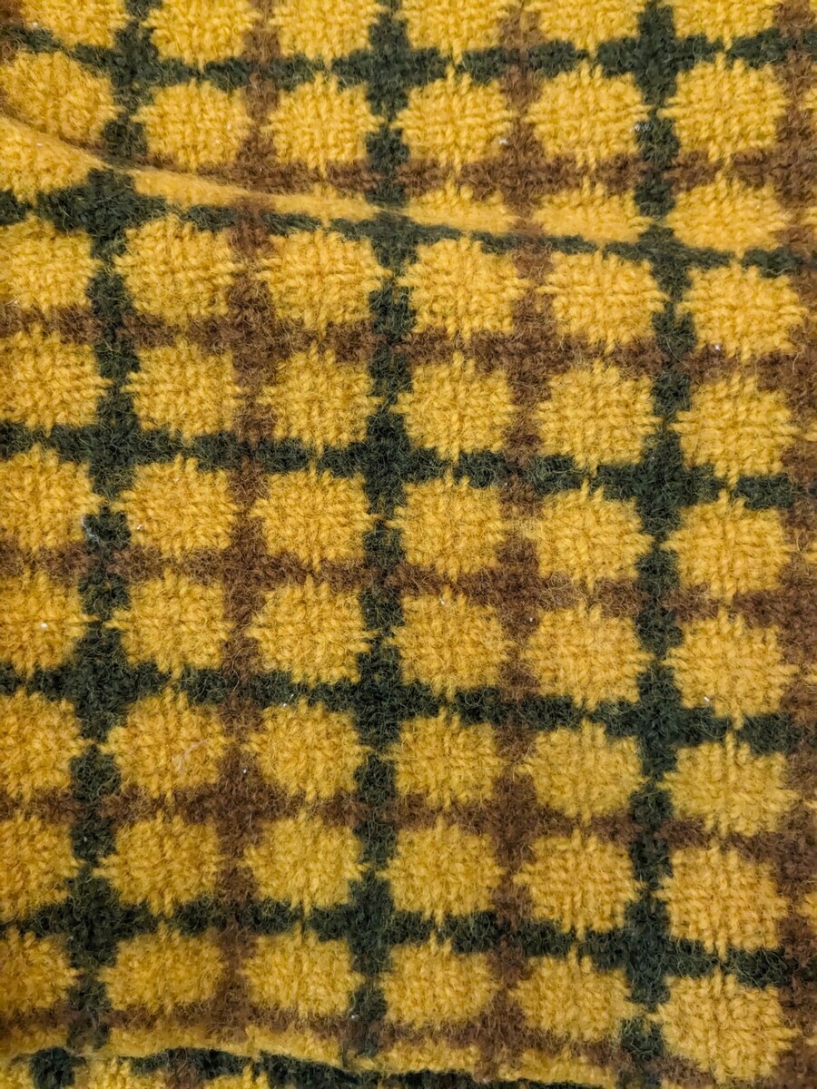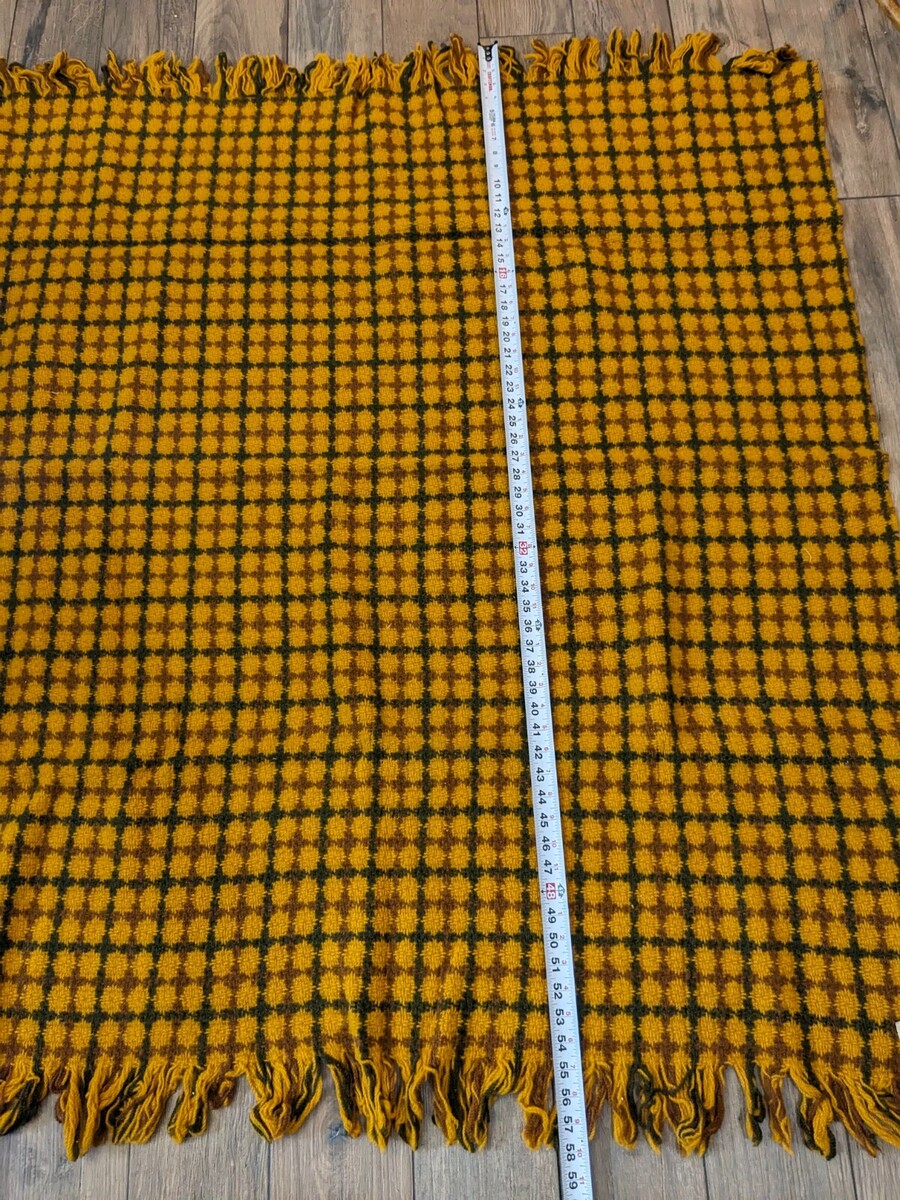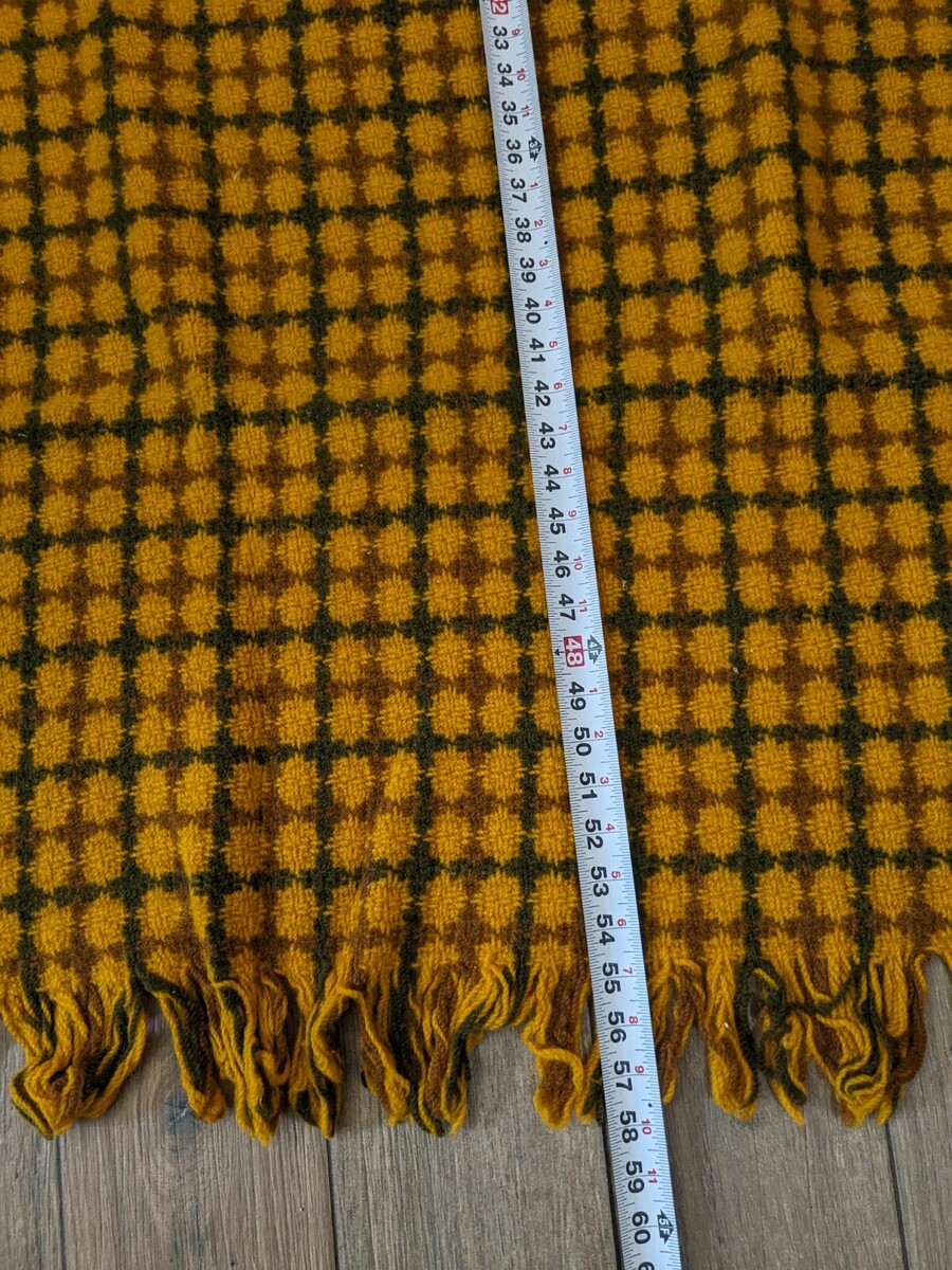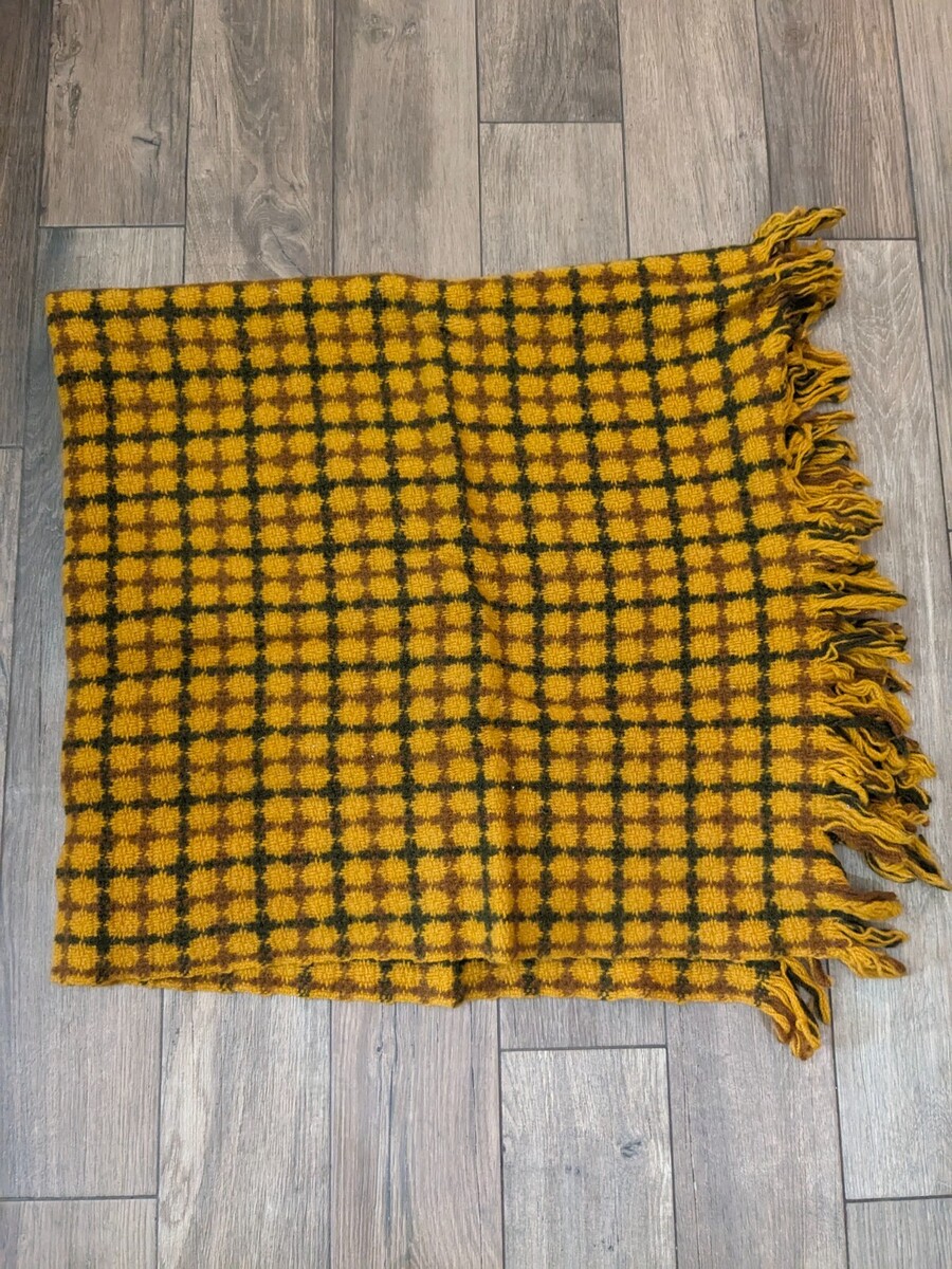 Colors of orange and brown in a plaid pattern. Fringed. Measurements in photos. See pics for details. Very good condition.