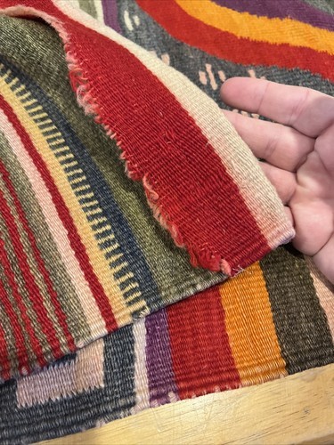 This beautiful vintage Peruvian wool tapestry is a one-of-a-kind piece of art that will add a touch of bohemian flair to any room. Handwoven with intricate Aztec Kilim rug design, this tapestry features a vibrant multicolor palette that will easily complement any decor. Made with high-quality wool material, this tapestry is both durable and soft to the touch.