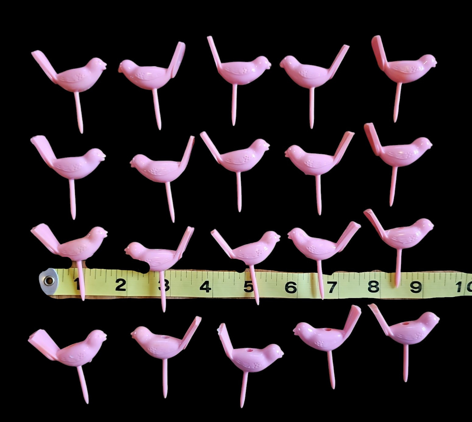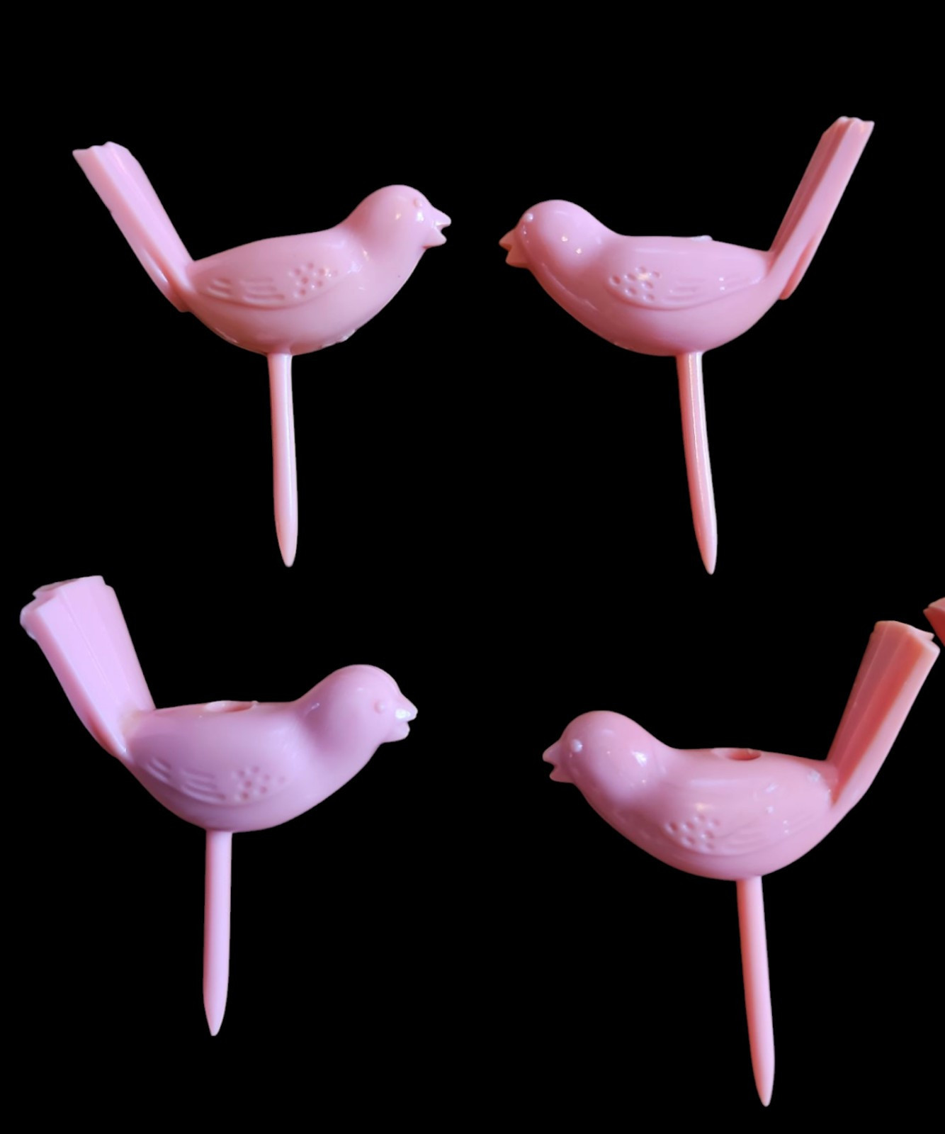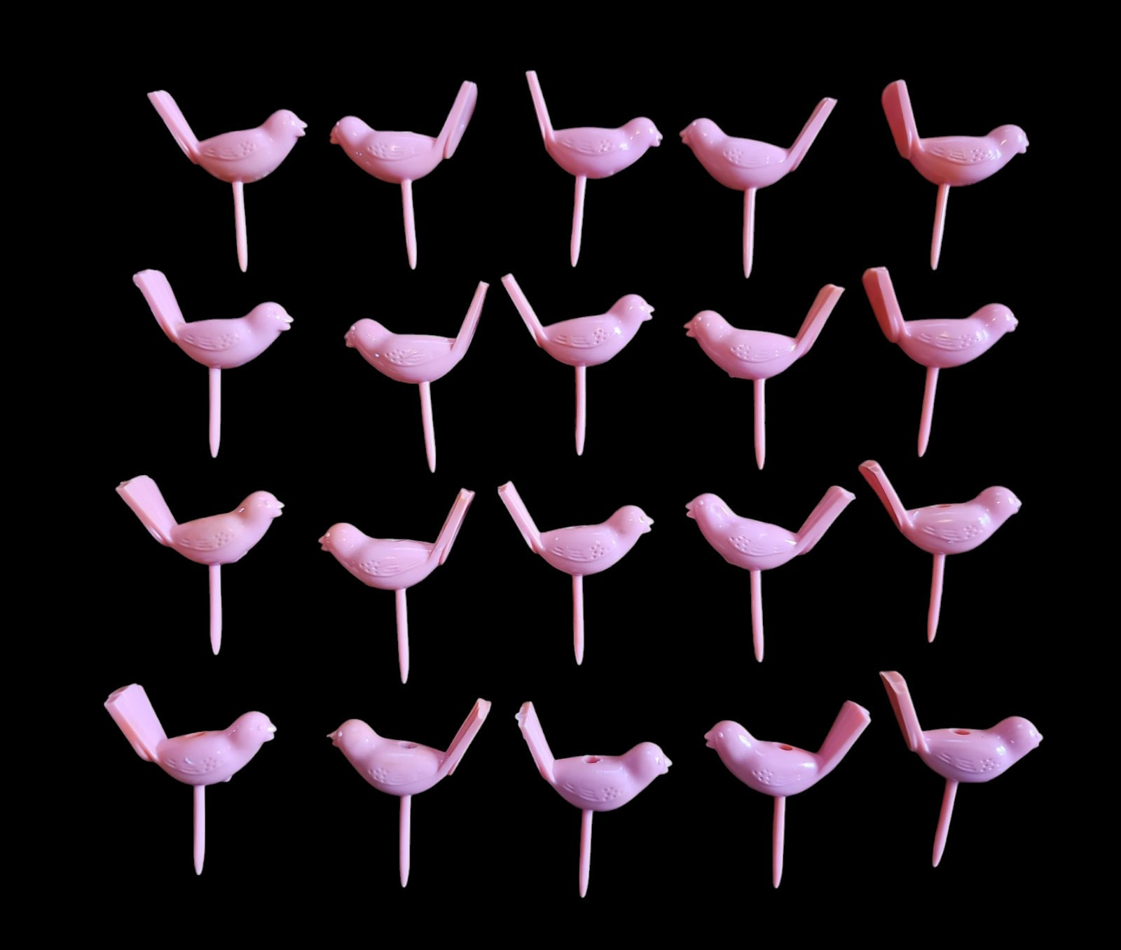 Add a touch of vintage charm to your next celebration with this set of 20 vintage pink plastic bird cupcake candle holders. Made from lightweight plastic, these adorable birds feature a hole on top to securely hold a birthday or celebration candle. Perfect for retro-themed parties, baby showers, or collectors of vintage cake decorations.