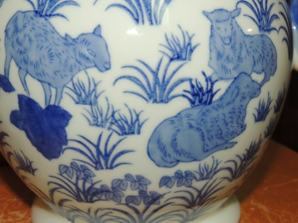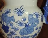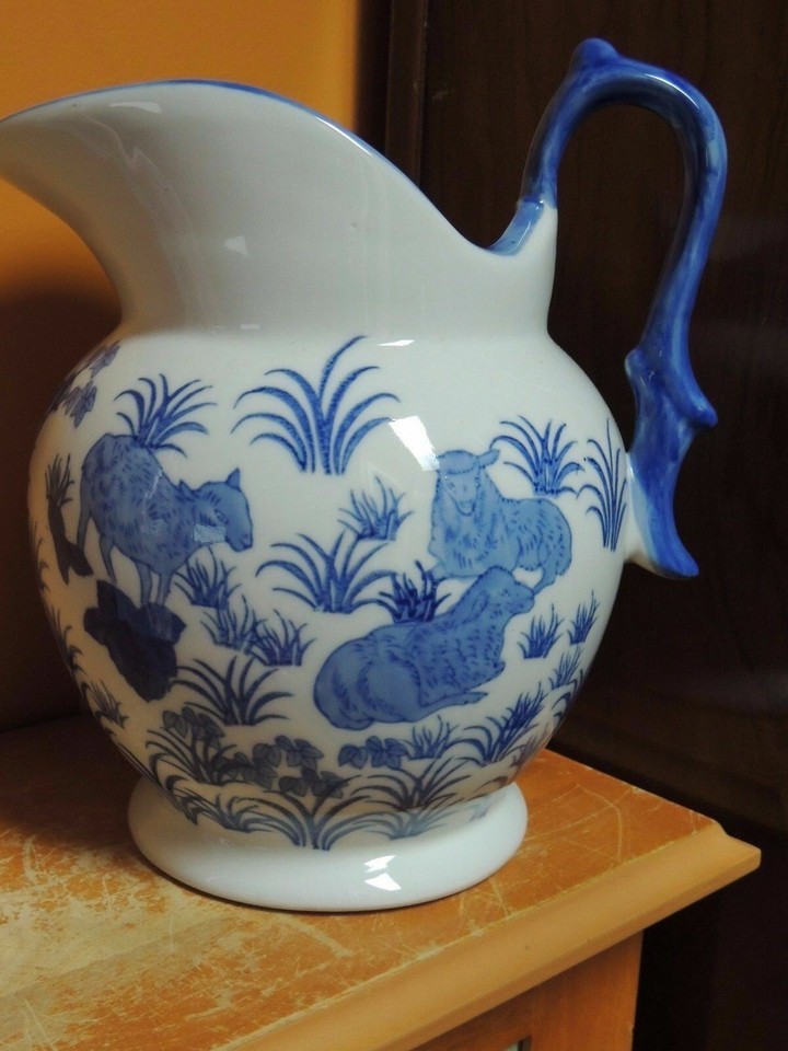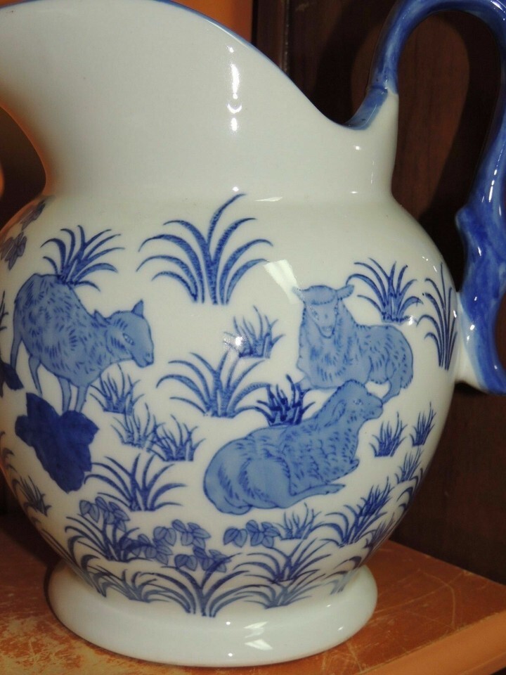 - Vintage Pitcher 9+" unsigned Blue & White woman carrying water Sheep Goats