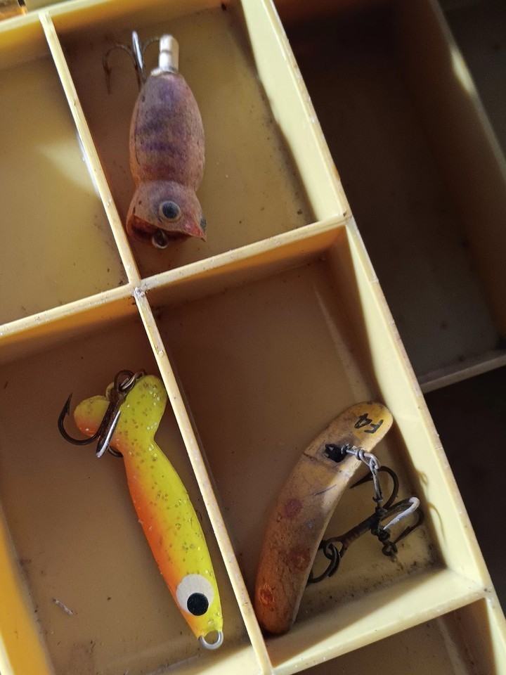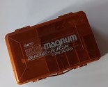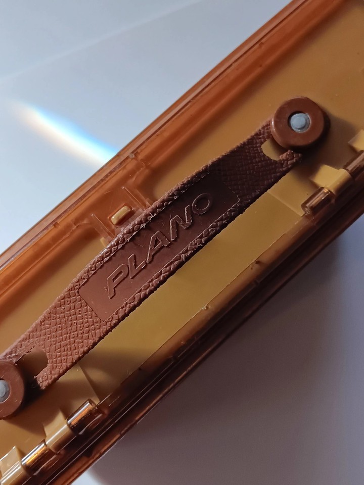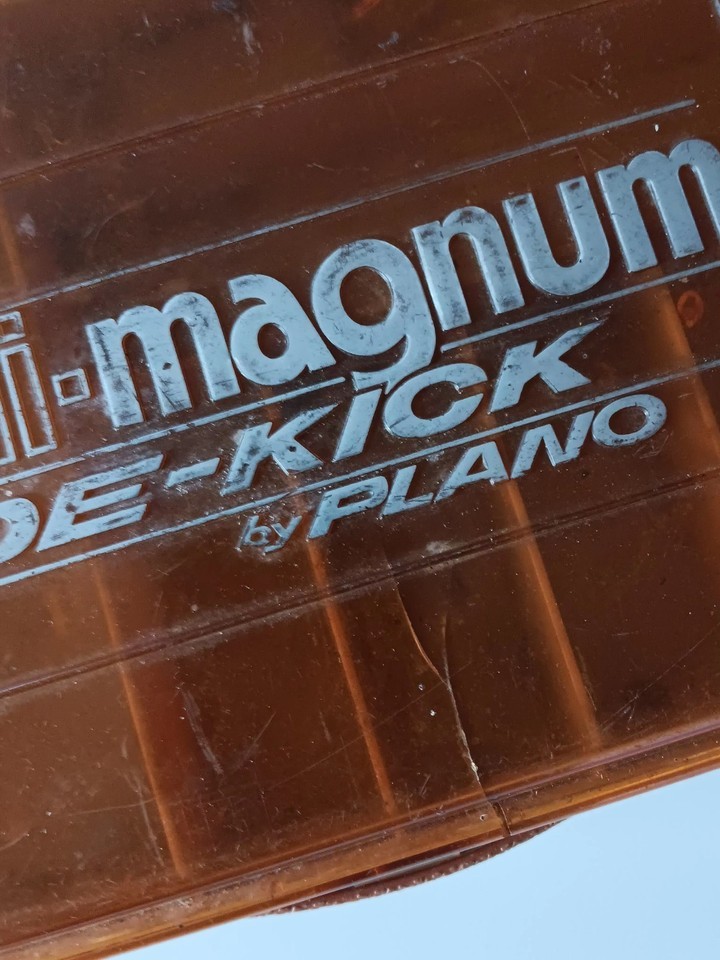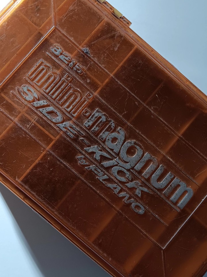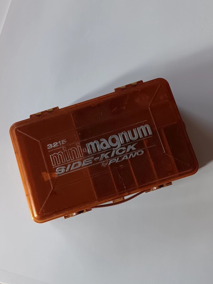 The Vintage Plano Mini-Magnum Side-Kick 3215 2 Sided Tackle Box is a nostalgic find for fishing enthusiasts. This orange tackle box, made of plastic and metal, features the iconic Plano Mini-Magnum Side-kick model with the added bonus of some lures included. Perfect for organizing and storing fishing essentials, this vintage tackle box adds a touch of retro style to any angler's collection. It's not perfect, but it's still functional.