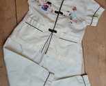 UP FOR SALE: Adorable vintage Plum Blossoms toddler girl 2-piece set. Traditional Chinese-style embroidered outfit featuring a short-sleeve top with frog button closures and matching pants. Ivory/cream with colorful embroidery including children and flowers. Black piping detail throughout.