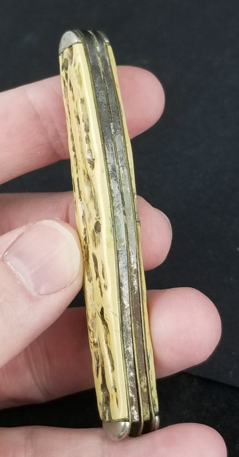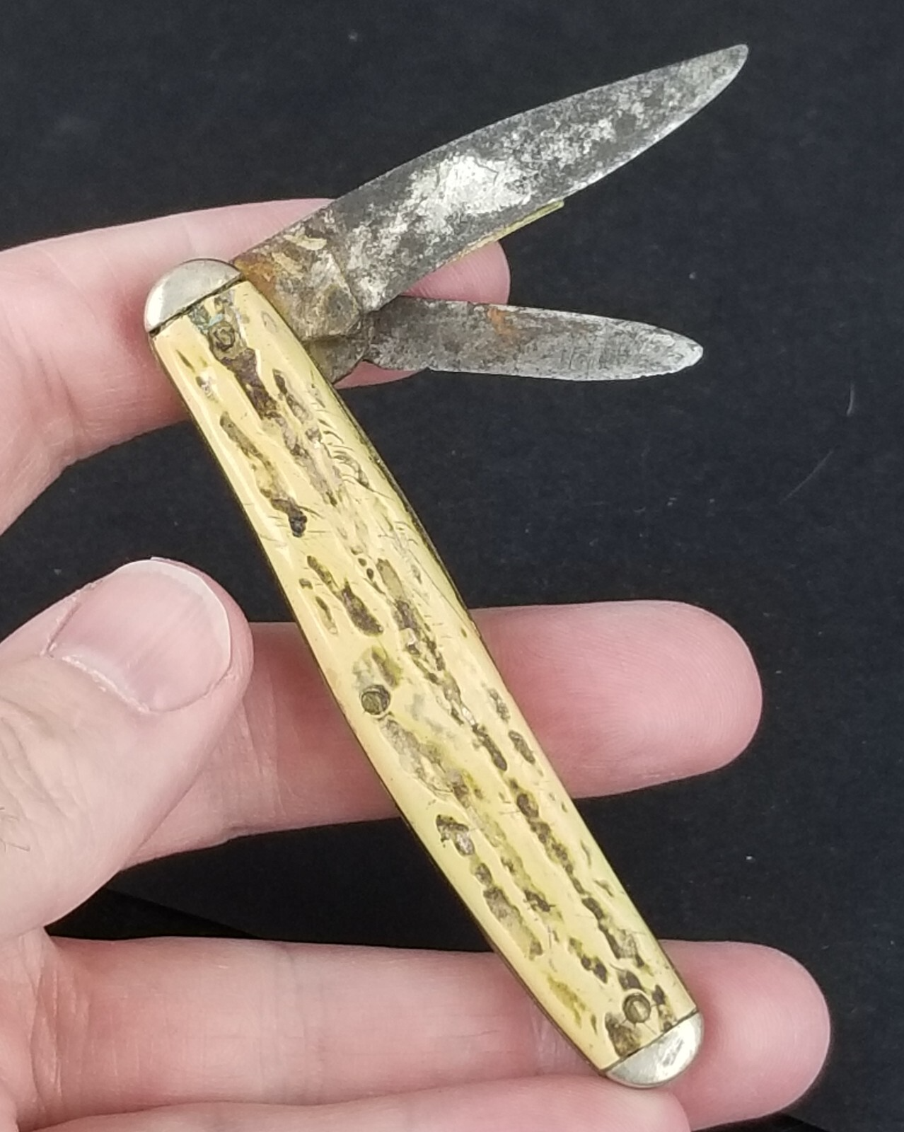 Condition: Handles are in good shape with some signs of age. No chips. The knife still has its shield. The blades could use some cleaning. One has been sharpened down. SEE PICTURES.