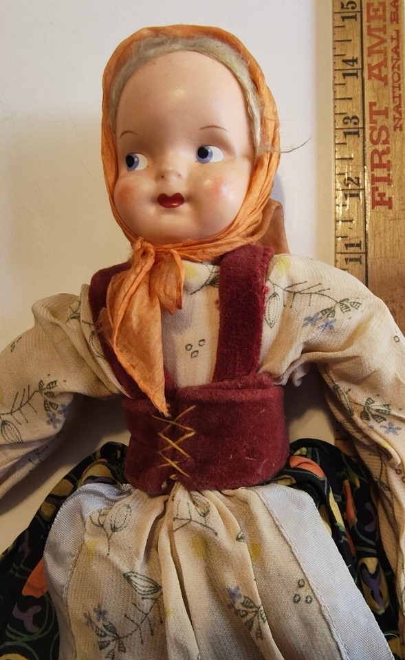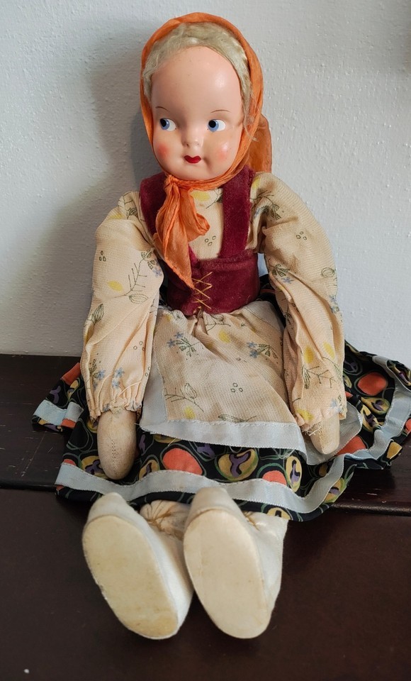 Vintage Polish Sawdust rag Doll Blonde Blue Eyes celluloid face