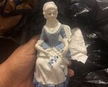 Add a touch of vintage charm to your decor with this exquisite porcelain figurine. This elegant piece features a lady sitting, adorned in a beautiful blue and white gown with delicate gold accents. The intricate detailing and classic design make it a perfect collectible or decorative item for any home. Ideal for display on shelves, mantels, or curios. This figurine is in excellent condition, showcasing its timeless beauty. Perfect for collectors of porcelain figures or those looking for unique home accents.