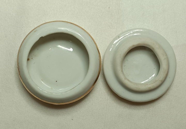 This vintage porcelain miniature trinket box and plate features a round shape in a small size, making it perfect for storing small treasures or keepsakes. The multicolor Victorian style adds a touch of elegance, while the glossy finish gives it a luxurious look. The trinket box is an original piece, adding to its charm and collectible value. Made of high-quality porcelain, this set is a unique and charming addition to any decorative collection. size: trinket box is 2" x 1", Plate is 2-1/4" round..