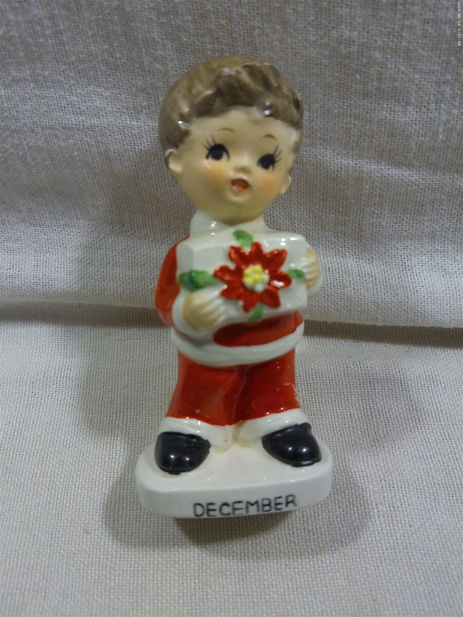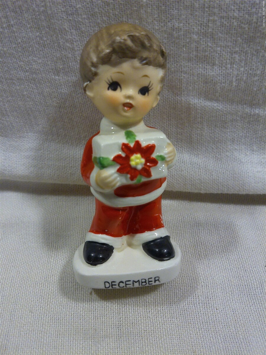 This is a vintage Price Imports Japan Ceramic Christmas December Birthday Boy figurine. The boy is super cute holding a gift in his hands - the base is marked December in black. The original gold foil Price Imports Japan label is attached to the bottom of the figurine. The figurine measures approximately 4 1/8" tall and 2" wide. Nice clean cute Price Imports Japan ceramic Christmas December birthday boy figurine that displays absolutely great when sitting on a shelf!