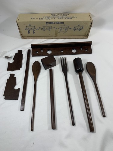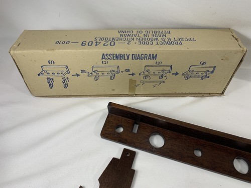 This is brand spanking new, old stock, never assembled, with instructions on front of box. While it is new, I am not sure, there may have been a rolling pin that was to go on the bottom . No evidence of one existing here. This is meant to be hung on the wall as there are screw holes on the backside. Last image is for reference only, shows one similar assembled, but sitting on the counter top.