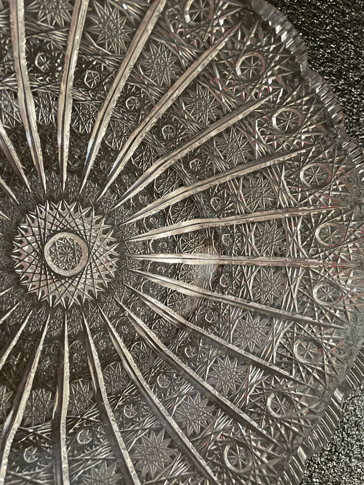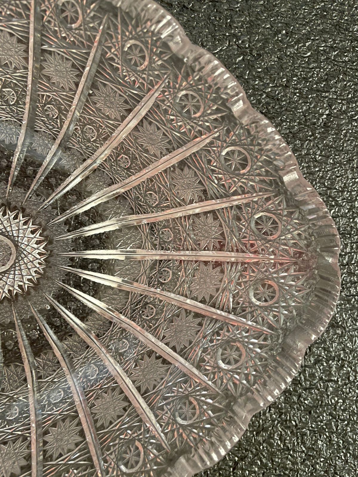 Simply stunning! Words and pictures don't do this gorgeous glass crystal bowl justice. There are so many hand cuts on this piece, and the name Queen Lace is so appropriate because it looks very lacy. This round, shallow bowl is European Czech Republic, Bohemian Finest 24% lead hand cut crystal. Handcunt 24% lead crystal. Blown glass handcrafted. Unmarked and labeled missing. Thick and heavy, Safe for daily use. Hand wash only highly recommended. Weight 4 lbs. Note, we do not accept returns on vintage. Please review carefully. Measurements, 11 inches in diameter. 2.4 inches high. Excellent vintage condition. No chips or cracks. All teeth on the Sawtooth rim accounted for. Vintage Bohemian Czech. Queen lace handcut lead crystal blown glass. Bohemian leaded glass (crystal) is renowned for its exceptional clarity. Brilliant and sparkle. This is an outstanding, gorgeous vintage piece. Insurance included in the purchase of this item for full amount. We take super care in packing all fragile items and take pride in getting items to their new homes intact. Non smoking pet free home.