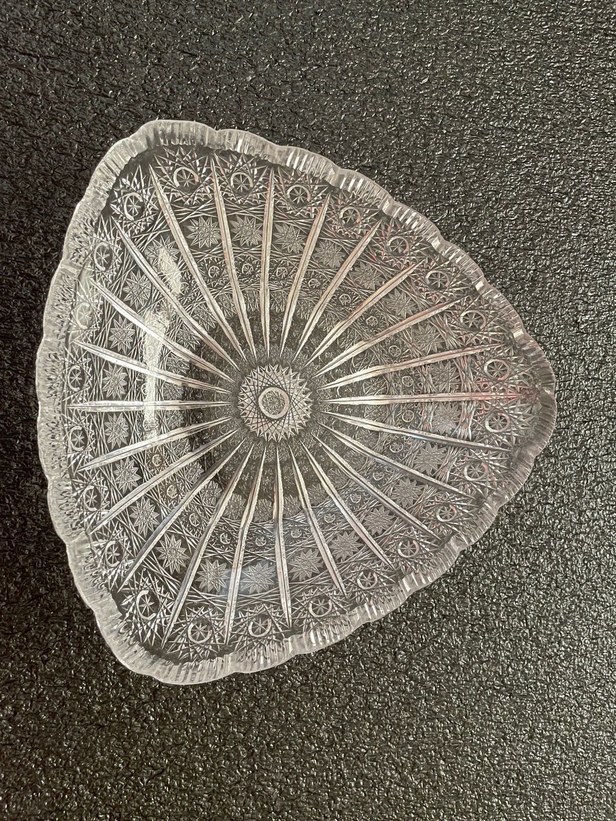 The crystal is good quality and has a cut design on two sides and rounded 'fan' design on the two alternative sides with a Star design cut into the base;