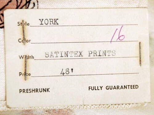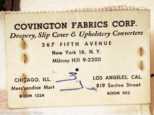 Nice piece of vintage historical fabric, this one is called "York" and is a mocha brown, peach and pale green abstract print. The fabric is called Satinex Prints and has the original tag form the Covington Mills Corp, Fifth Ave, NY. Measures 48 x 56"