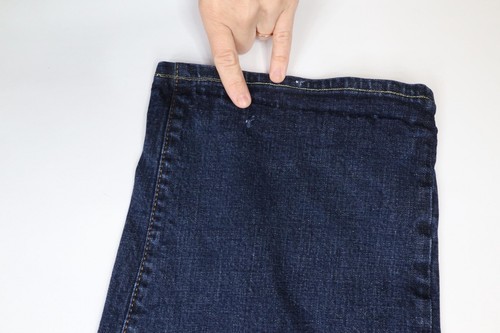 Hole bottom right leg. Distressed and faded. Inseam hemmed