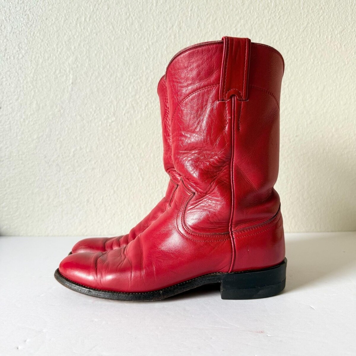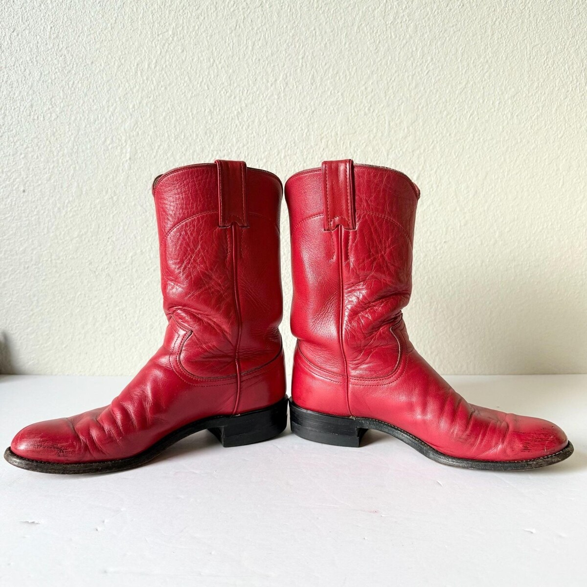These boots are a really pretty nice shade of red?just the right amount of scuffs on the toes to be worn in with a vintage feel. The leather is super soft! Great style to wear with jeans or flow dresses. These are the Justin Roper style with red pulls.