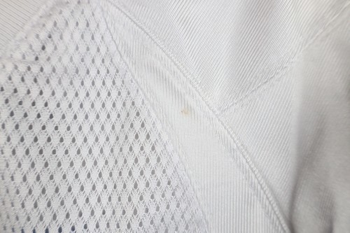 Stain front top left, back bottom. Blemish right shoulder. Collar discolored, loose threads shoulders. Graphics faded. Sheer fabric