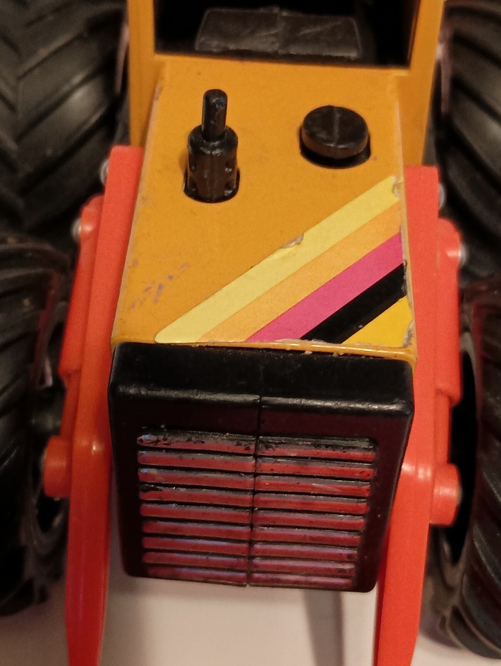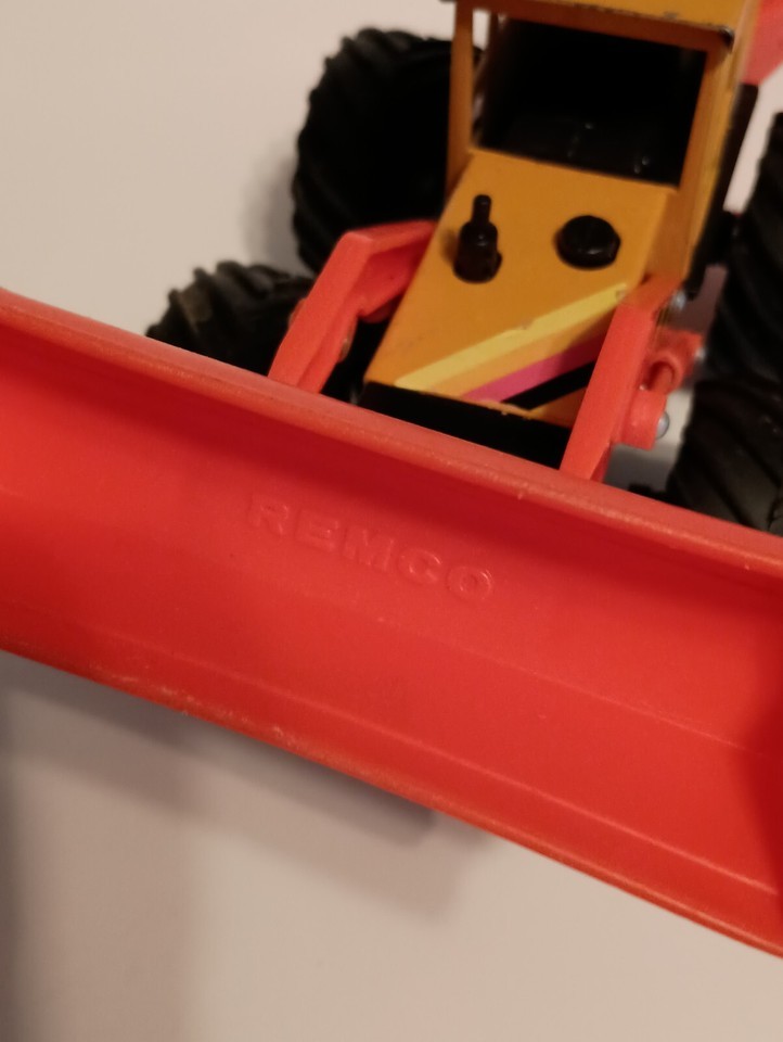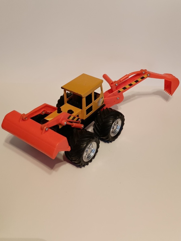 This vintage Remco Front-End Loader/Backhoe toy from the 1980s is a vibrant yellow and orange construction vehicle made of pressed steel and plastic. It features rubber tires, a front-end loader, and a backhoe, capturing the essence of construction equipment play. Suitable for children aged 8-11 years and collectors aged 17 years and up, this toy is part of Remco's Construction series and is a representation of a construction vehicle character family. Made in China, this toy offers a nostalgic touch to those who appreciate vintage toy vehicles. Rare find with this color combination. Not Perfect but it's still a diecast from the past. All sizes are approximate.
