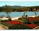 This vintage lithograph postcard captures a stunning view of Portschach am Worthersee, a picturesque resort town in Karnten, Austria. The vibrant image showcases a beautifully maintained flower garden in the foreground, with colorful red, yellow, and purple blooms contrasting against the serene blue waters of the Worthersee lake. Sailboats glide gracefully across the water, framed by lush forests and rolling hills in the background, evoking a tranquil lakeside retreat.