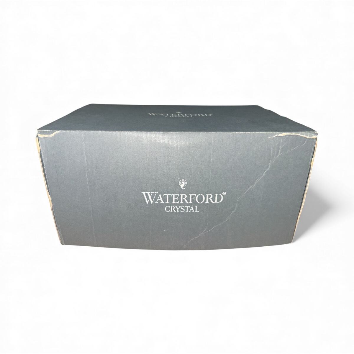 Up for your consideration is a Waterford Crystal footed pillar candleholder in the Bethany pattern. The candle holder has a round base that narrows to a central column that flares out again at the top to hold a pillar candle. The base section has vertical grooves, between which are crosses or Xs. The middle section has 8 flattened sides, with vertical cuts at the top and bottom ends and oval cut-outs along the face of the sides. The top section has a series of grooves, between which are cuts that look like flowers or leaves. The underside of the base has an 8-pointed star design. The candle holder comes with its original gold and green Waterford seahorse sticker, a white label on the underside of the base, and a grey Waterford Crystal box. In addition, it comes with a cream candle that has a silver sticker reading Waterford crystal.The candle holder stands 5 1/2 inches tall,measures about 4 inches across the base, and weighs 4 pounds, 4 1/8 ounces in the box. Box has a bit of damage.