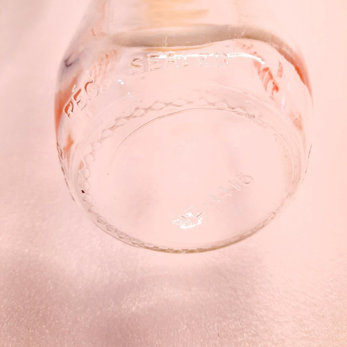 Glass bottle with reddish orange lettering. Cream colored pour cap. Scratches/wear from use.