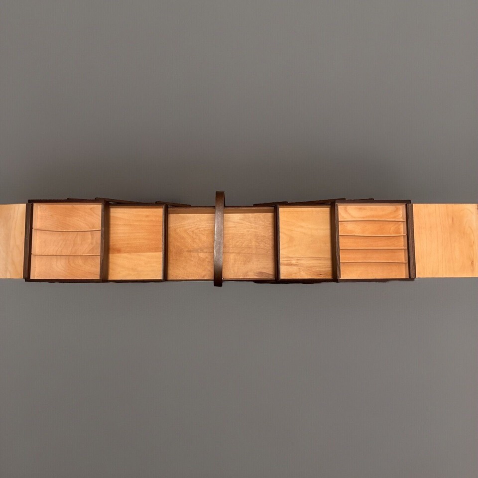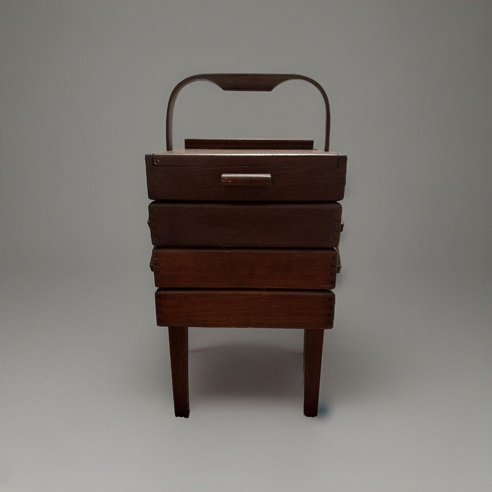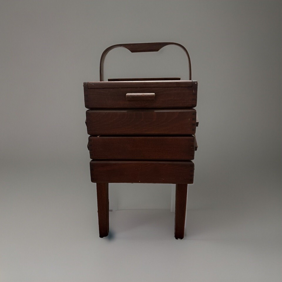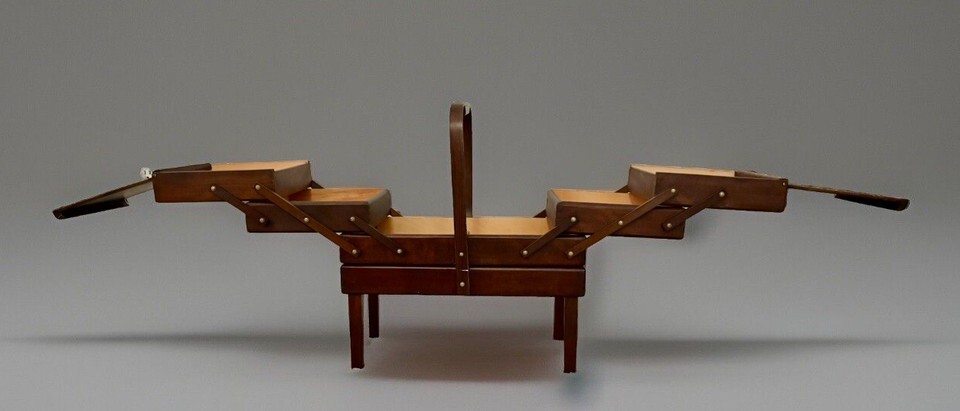 The vintage Romanian handmade wooden accordion box sewing chest is a charming sewing basket made out of wood in a brown color. This unique sewing chest features an accordion-style design, providing ample storage space for sewing supplies. With its vintage original design and craftsmanship, this sewing chest is a beautiful and functional piece that adds a touch of nostalgia to any sewing room. Made in Romania, this sewing chest is a testament to traditional craftsmanship and would make a wonderful addition to any collector's sewing collection.