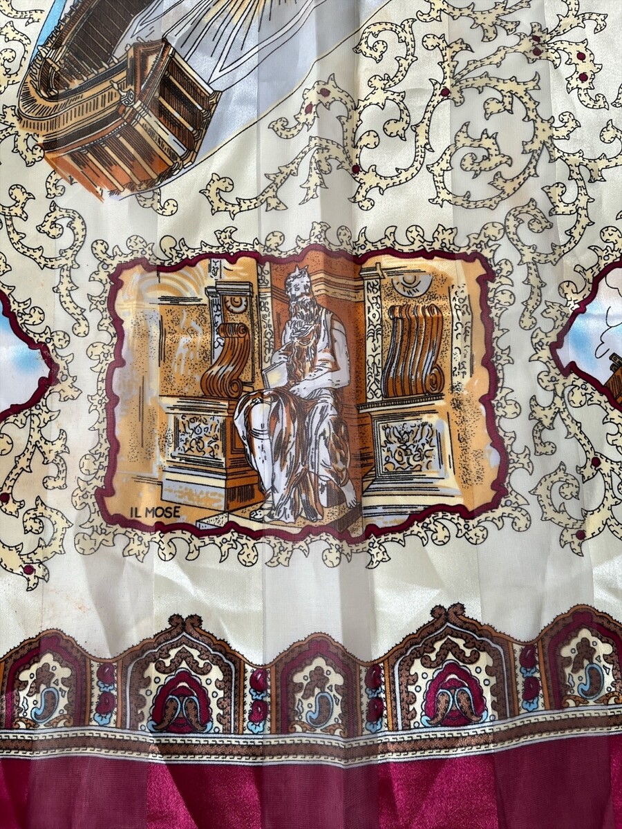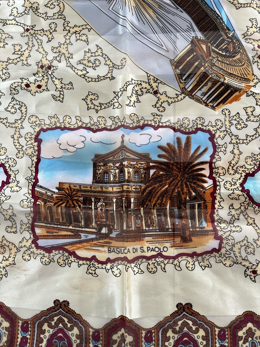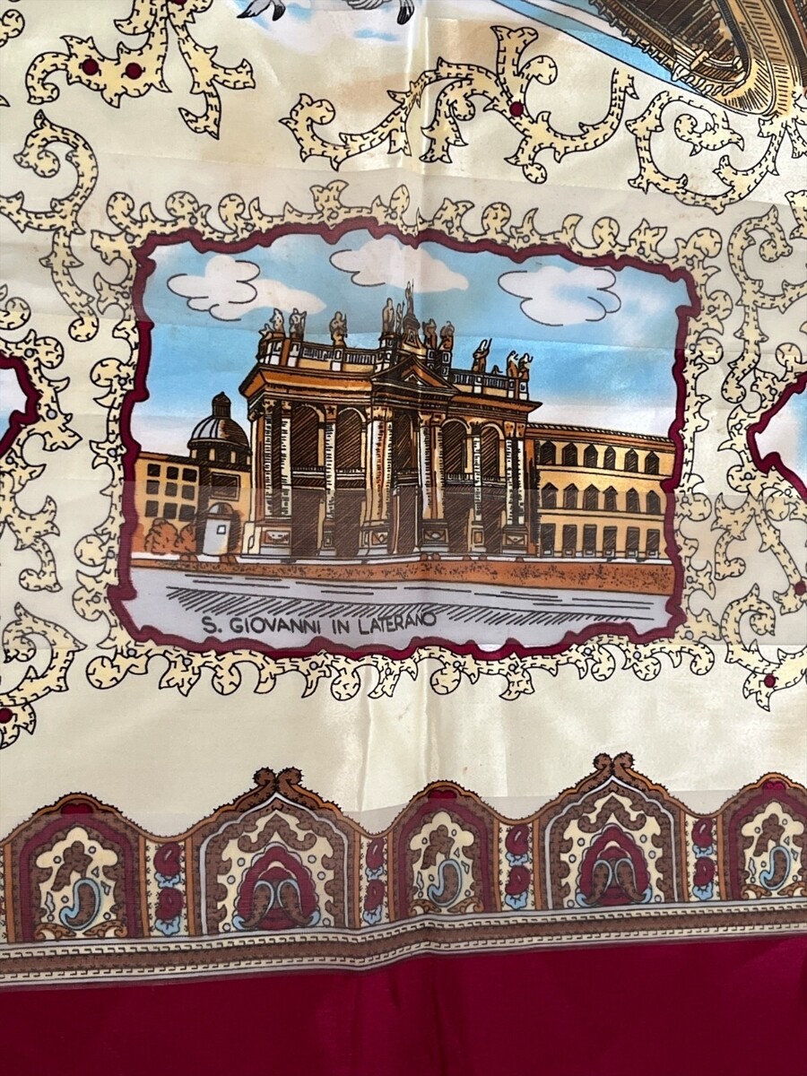 Large vintage souvenir scarf featuring iconic Rome landmarks including St. Peter?s Basilica, Piazza di Spagna, Castel Sant?Angelo, Basilica di San Paolo, San Giovanni in Laterano, La Pieta, and Il Mose. Made of silky polyester with a burgundy border and ornate scroll detailing. Beautiful as a wearable piece, wall decor, or framed textile art.