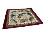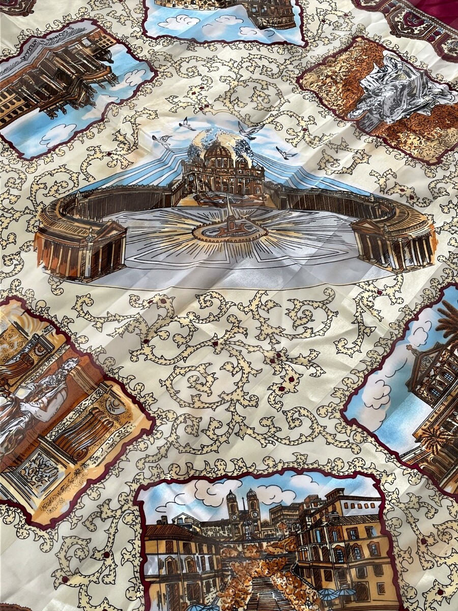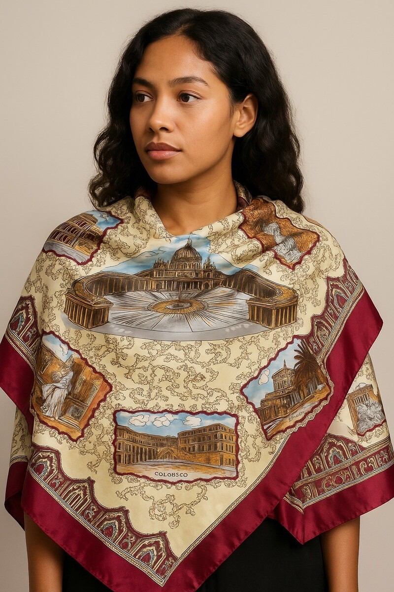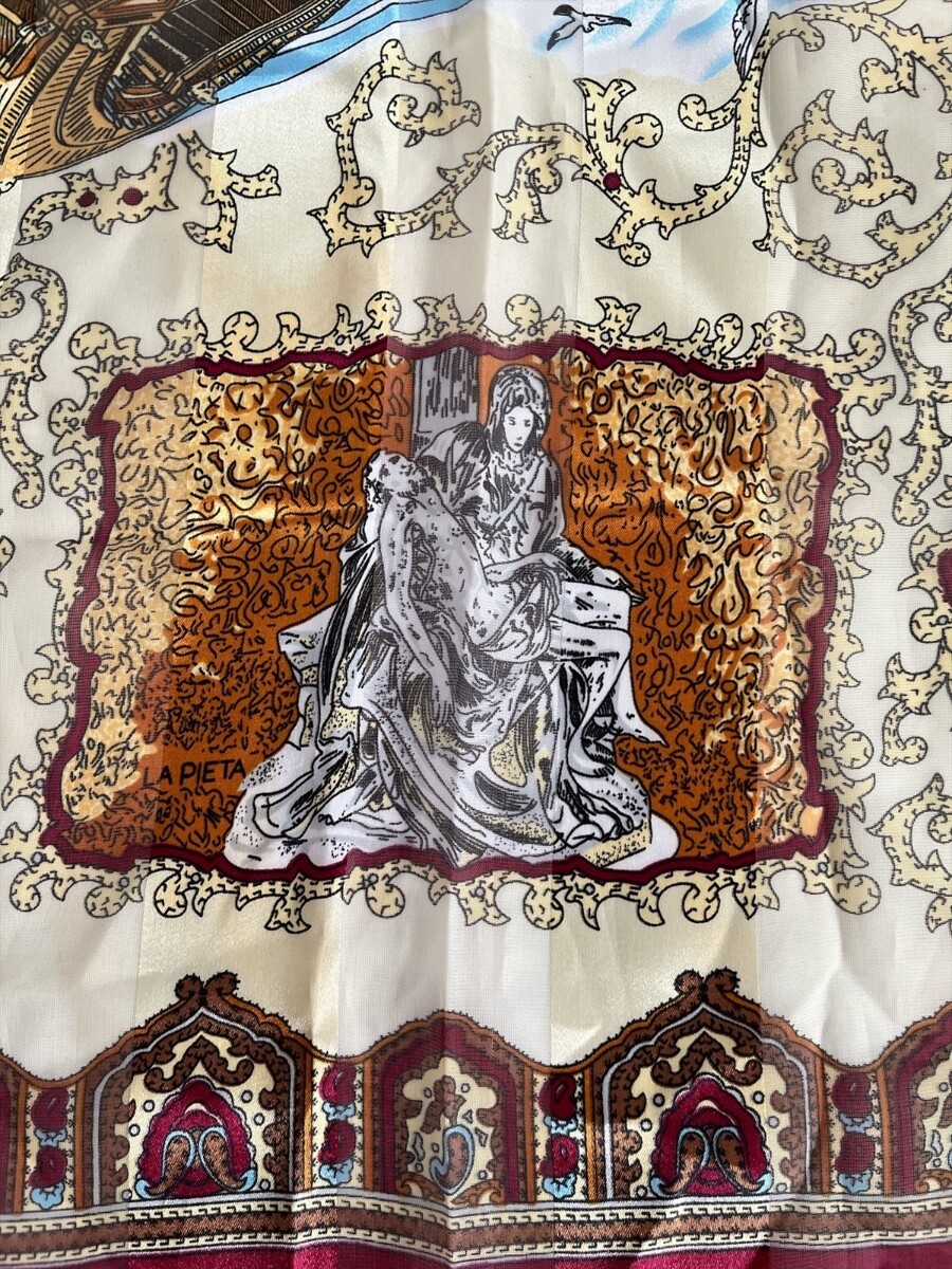 Large vintage souvenir scarf featuring iconic Rome landmarks including St. Peter?s Basilica, Piazza di Spagna, Castel Sant?Angelo, Basilica di San Paolo, San Giovanni in Laterano, La Pieta, and Il Mose. Made of silky polyester with a burgundy border and ornate scroll detailing. Beautiful as a wearable piece, wall decor, or framed textile art.
