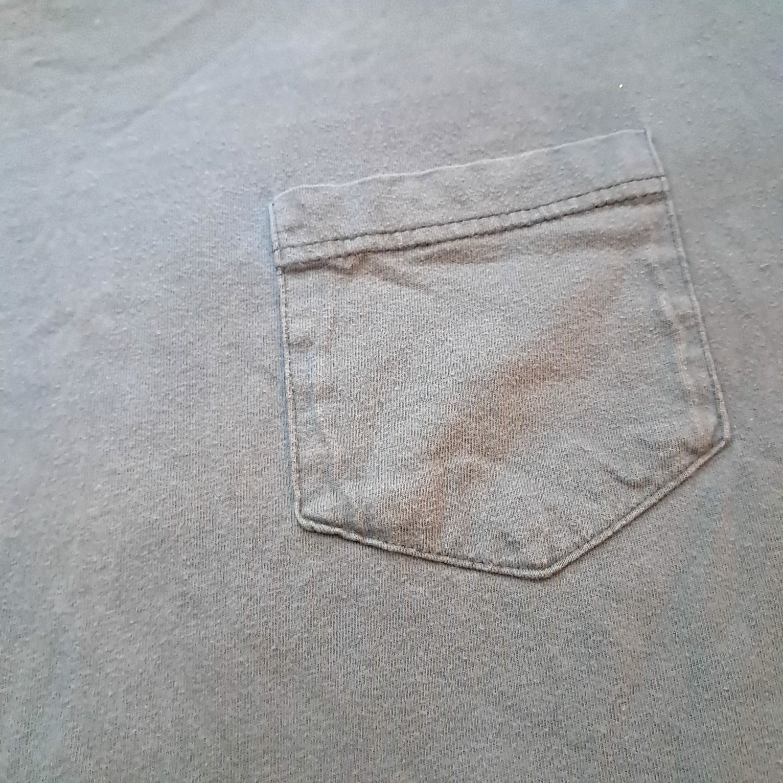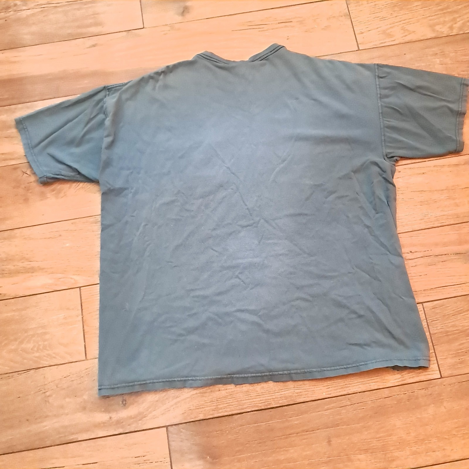 Solid dusty green/blueish color. Faded/worn/wash worn as shown. Soft pocket tee. short sleeves. See pics for measurements and details.