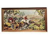 This striking large wall piece (44? x 24? including frame) depicts a classic hunting scene: two riders in traditional red jackets on horseback, surrounded by hounds in pursuit of a deer across a rolling landscape. The vivid autumnal colors and fine craftsmanship make it a standout decorative piece for lovers of equestrian art, hunting scenes, or French country interiors.