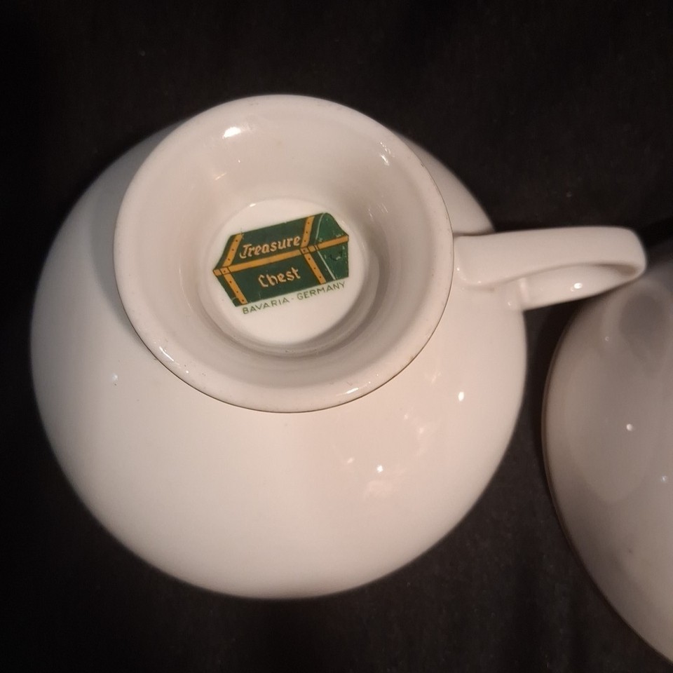 This vintage set of 3 treasure chest tea/coffee cups features intricate wheat and gold trim, imported from Bavaria, Germany. These decorative cups bring a touch of elegance and charm to any table setting. Made with high-quality craftsmanship, these cups are perfect for serving tea or coffee in style.