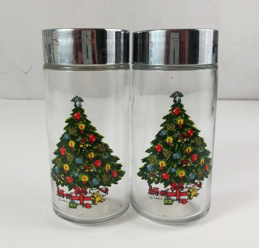 - Vintage Sabin Clear Glass With Christmas Tree Design 4.75" Salt & Pepper Shakers