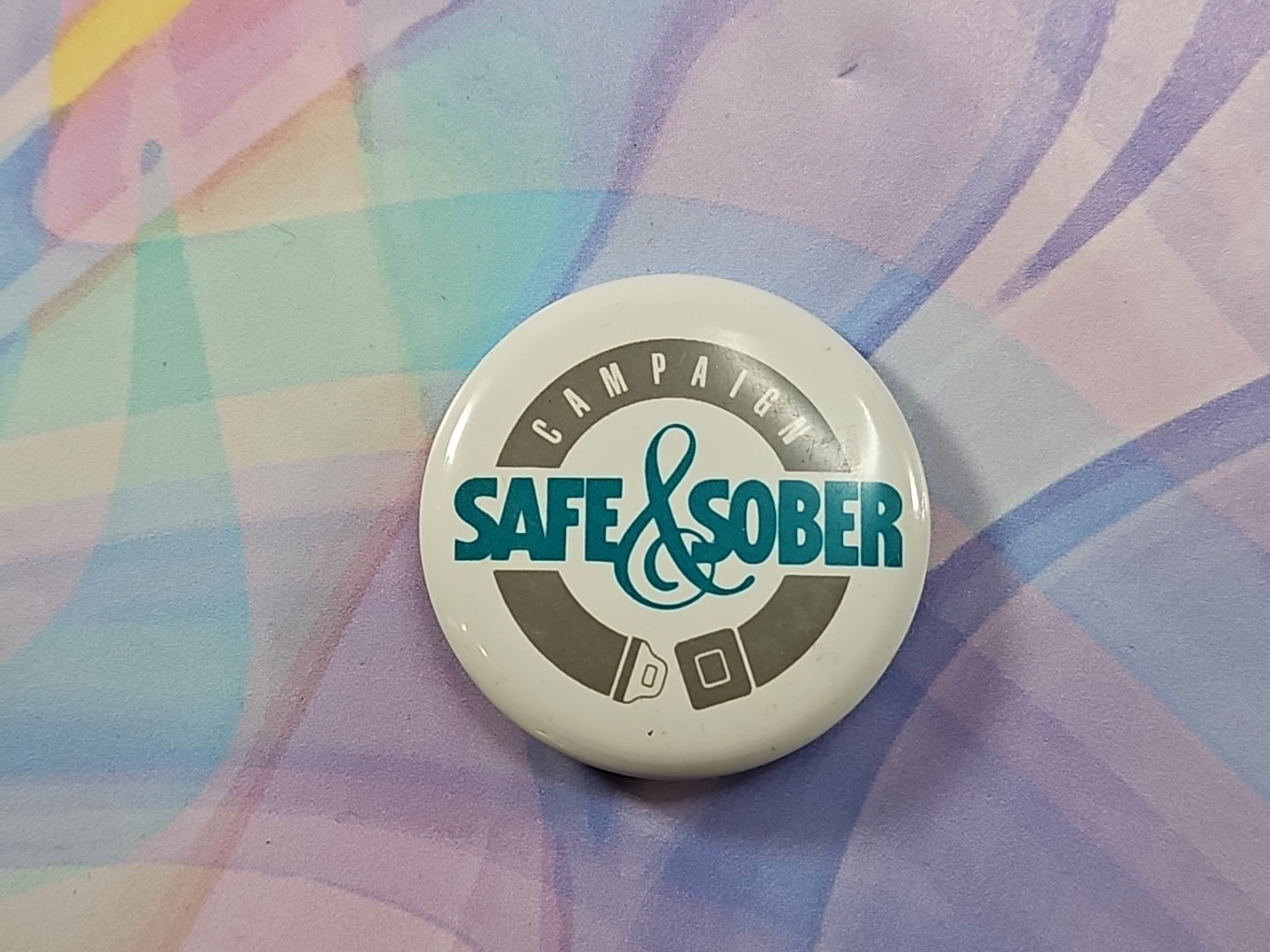 - Vintage "Safe & Sober" Campaign Pin, White/Gray, 1.625''