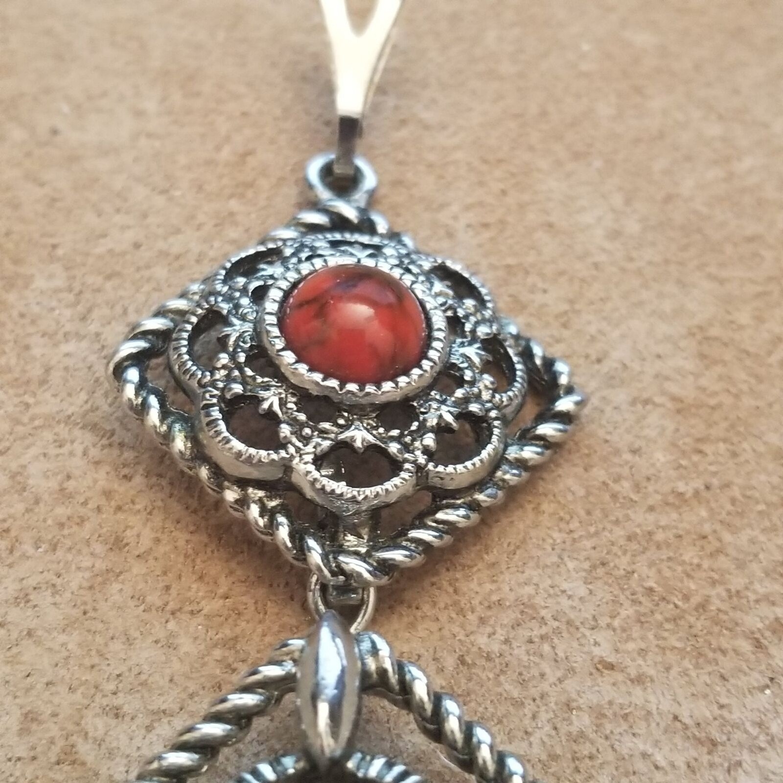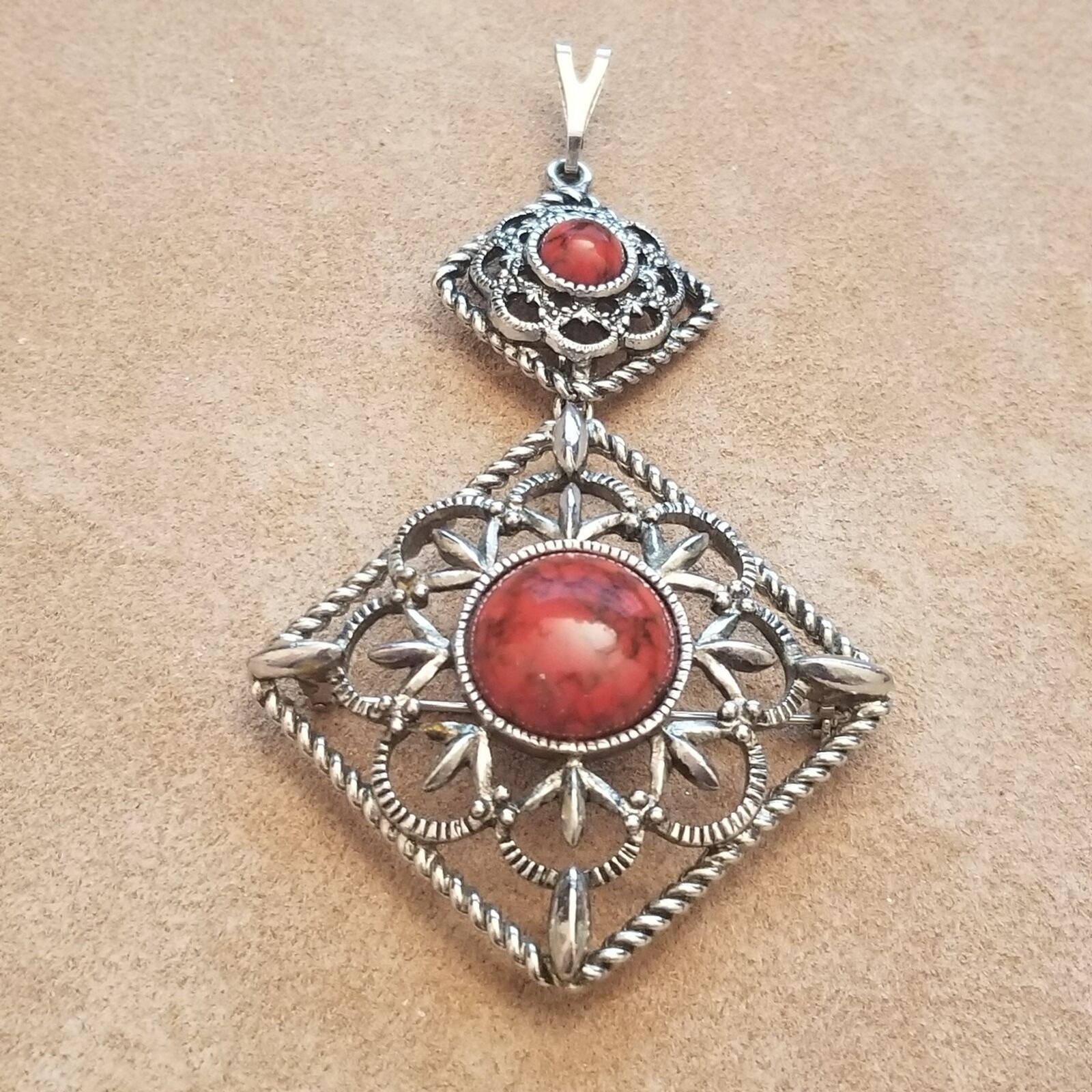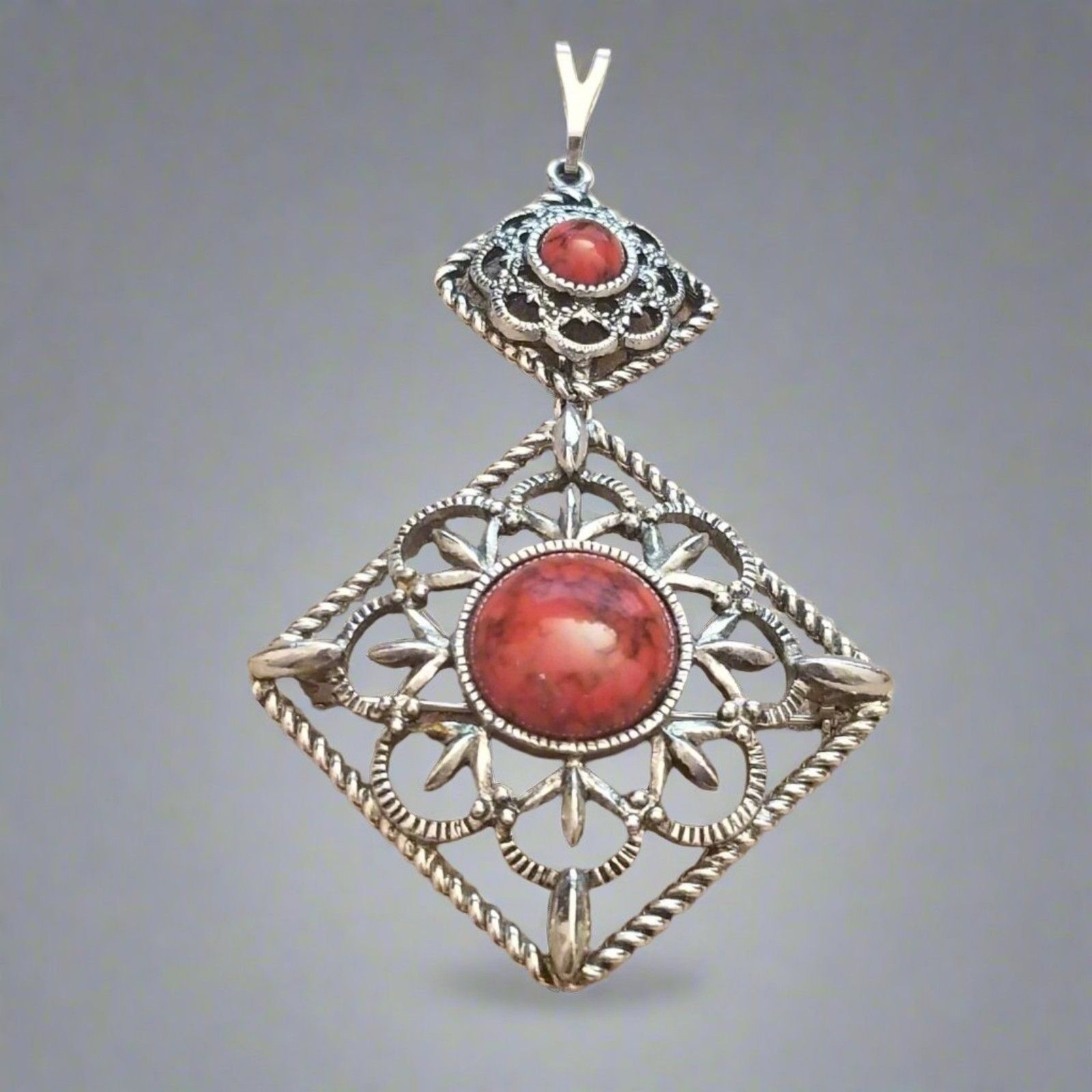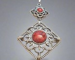 This vintage signed Sarah Coventry brooch features an ornate filigree design in silver tone metal, accented with bold red cabochon stones at the center and top. The diamond-shaped openwork pattern is framed with a twisted rope border, giving it depth and elegance. This versatile piece can be worn as both a brooch and a pendant, making it a standout addition to any vintage jewelry collection.