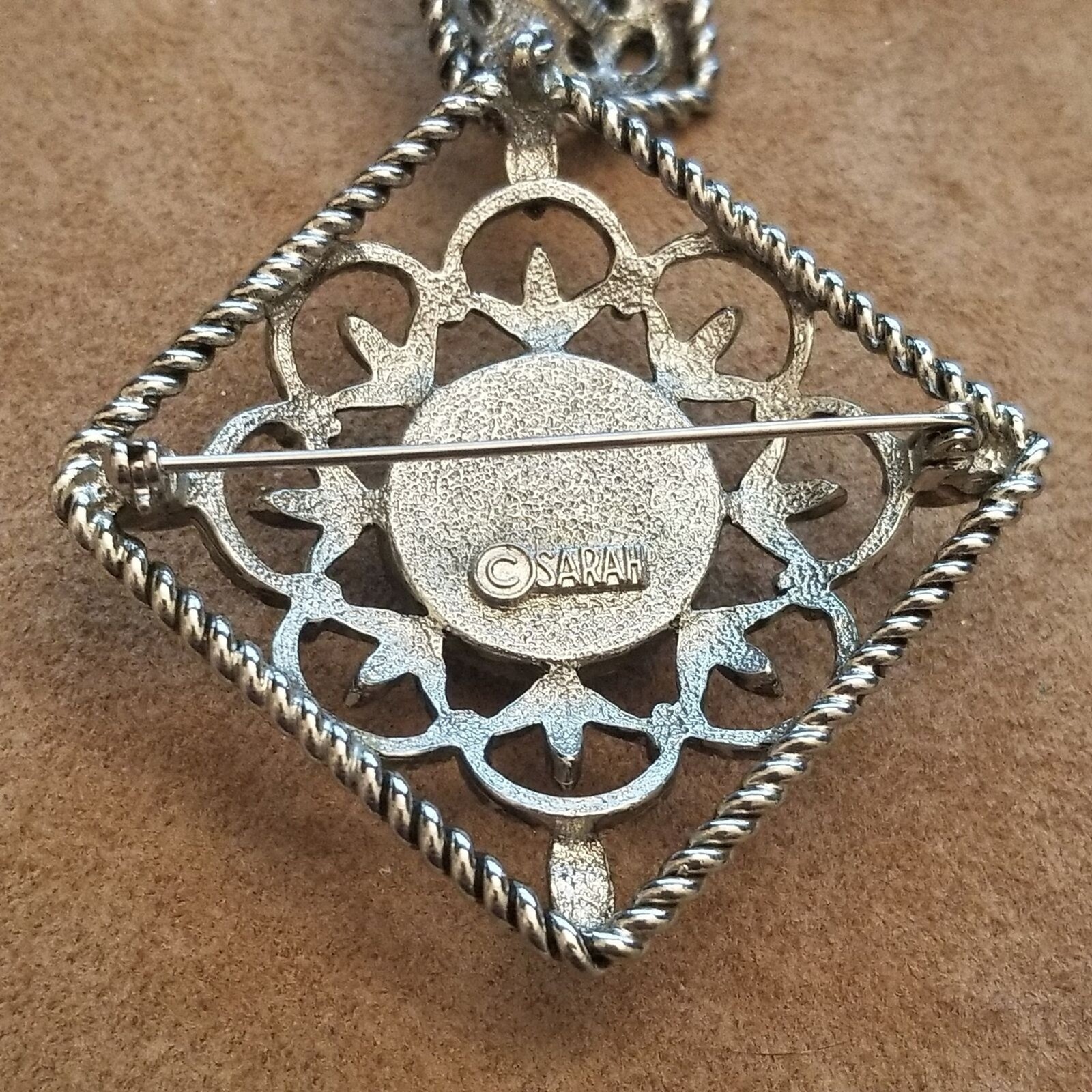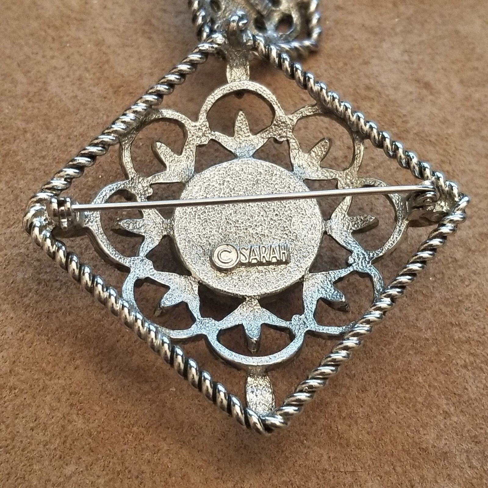 Sarah Coventry pieces like this one date from the 1960s?1970s, when bold filigree, convertible designs (brooch/pendant), and vibrant cabochon stones were a hallmark of their catalog and party jewelry sales.