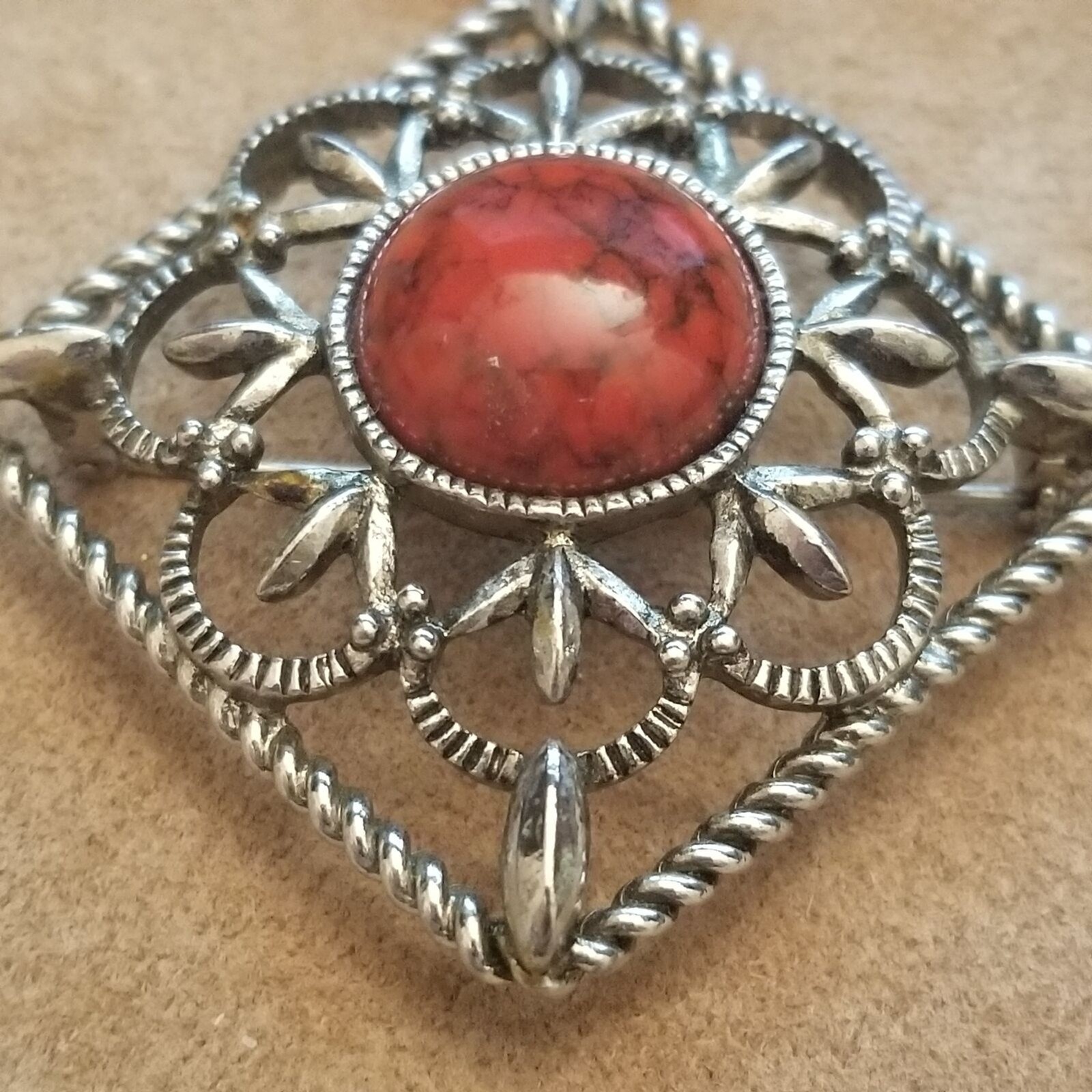 - Vintage Sarah Coventry Silver Tone Filigree Brooch /w Red