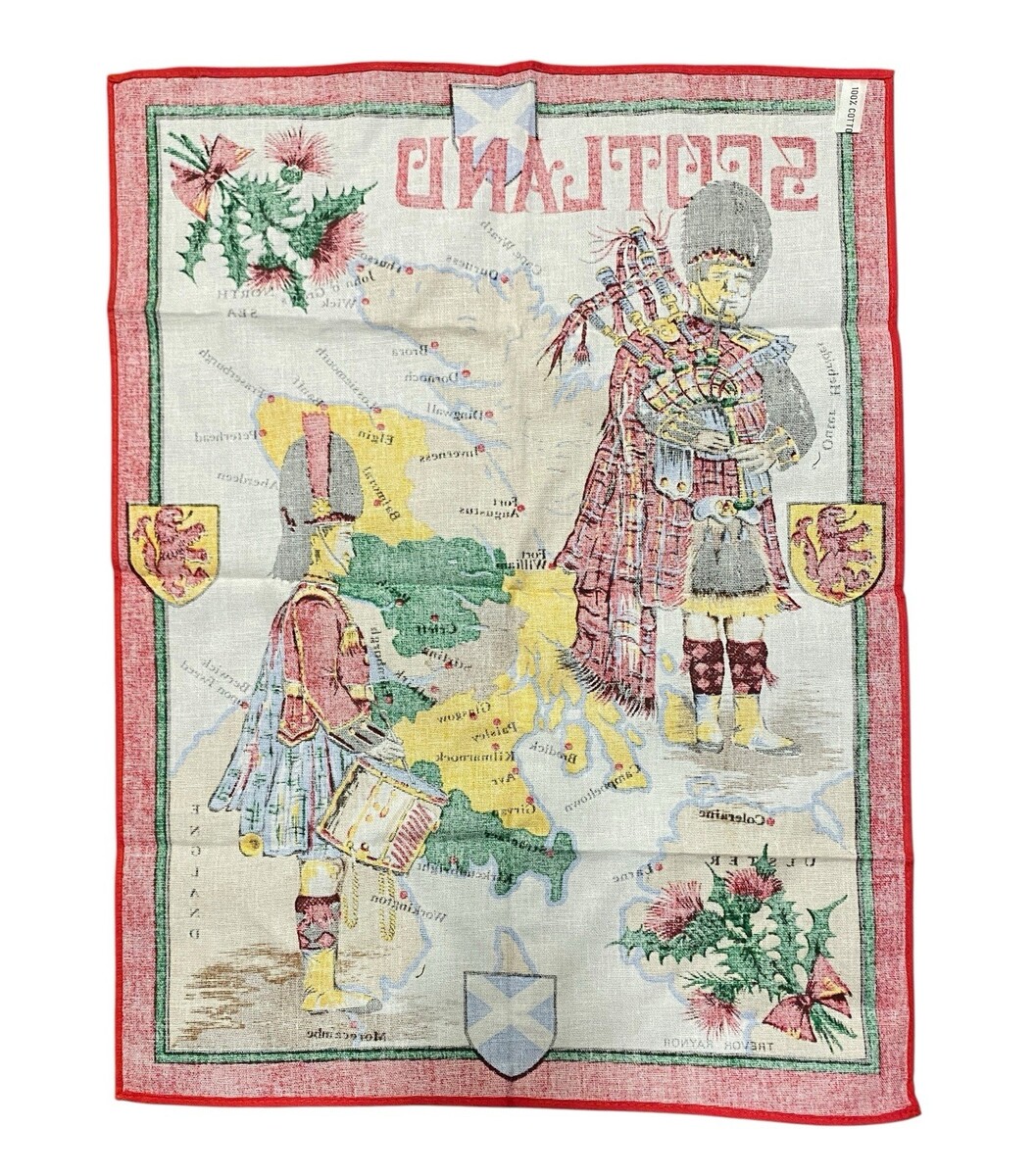 - Vintage Scotland Kitchen Tea Towel NWT Map Bagpipes Thistle Crisp Cotton 20 x 26