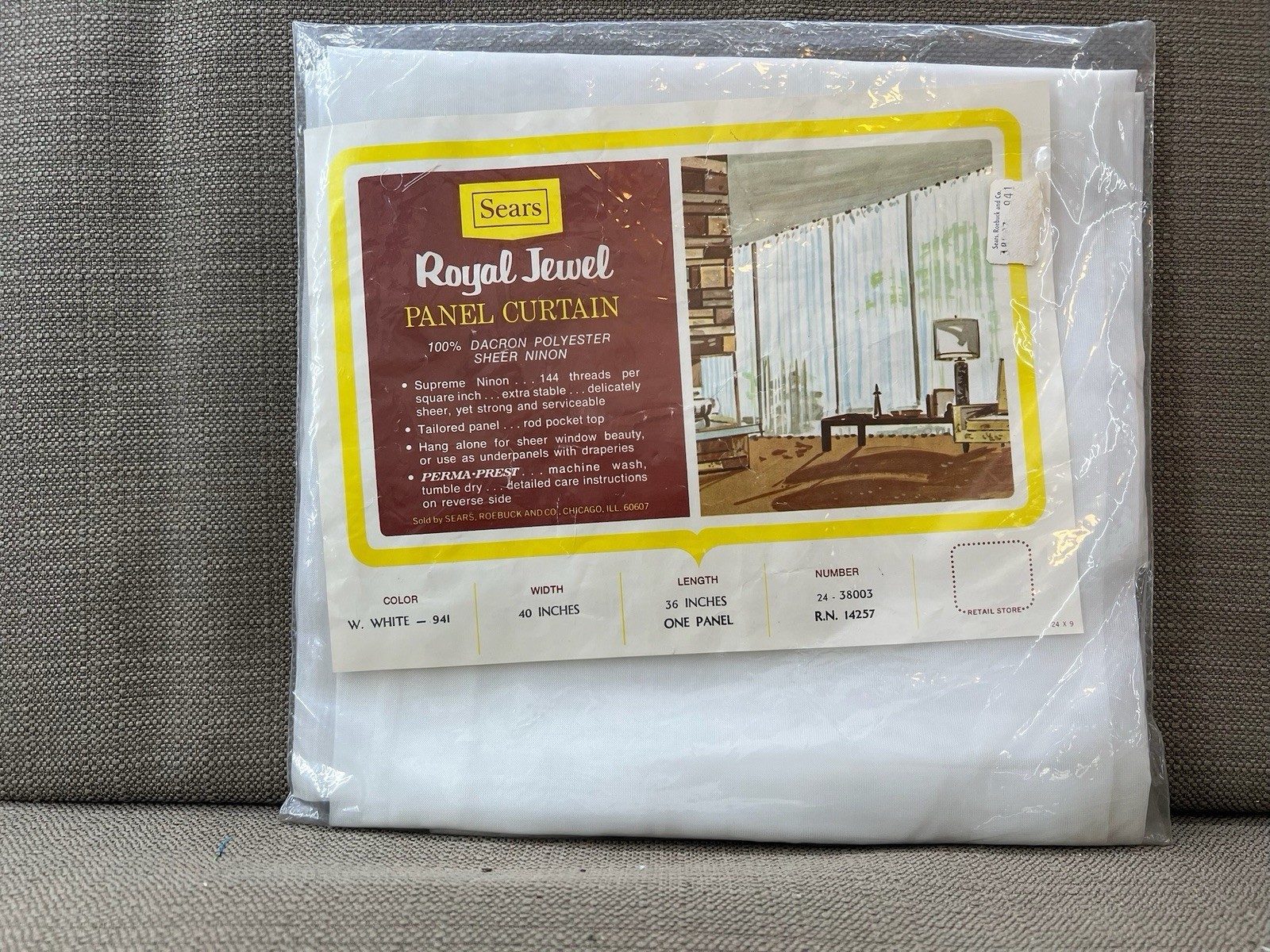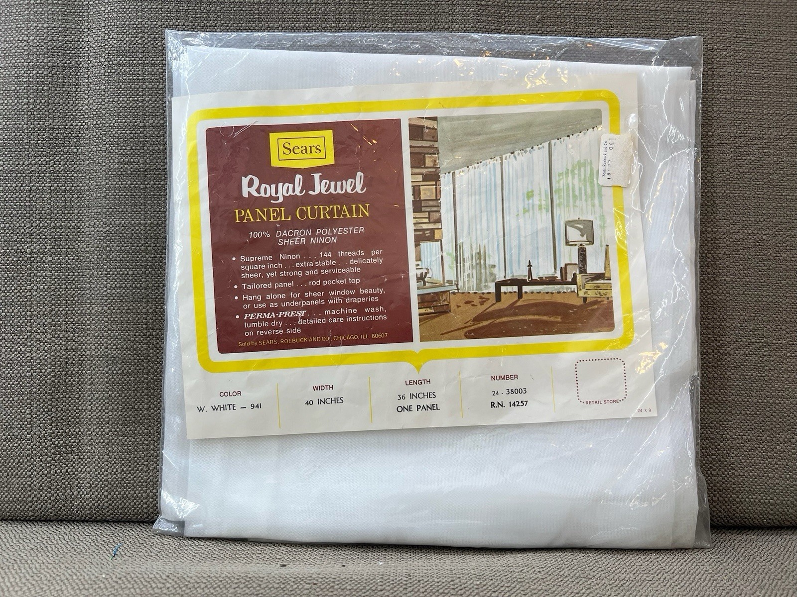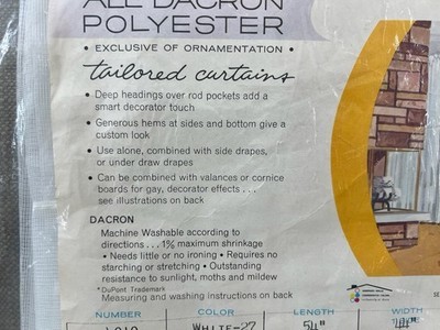 Beautiful vintage Sears Royal Jewel Panel Curtain, new in original packaging. Made of 100% Dacron polyester sheer ninon, this mid-century curtain features a tailored rod pocket top and Perma-Prest fabric for easy care and wrinkle resistance.