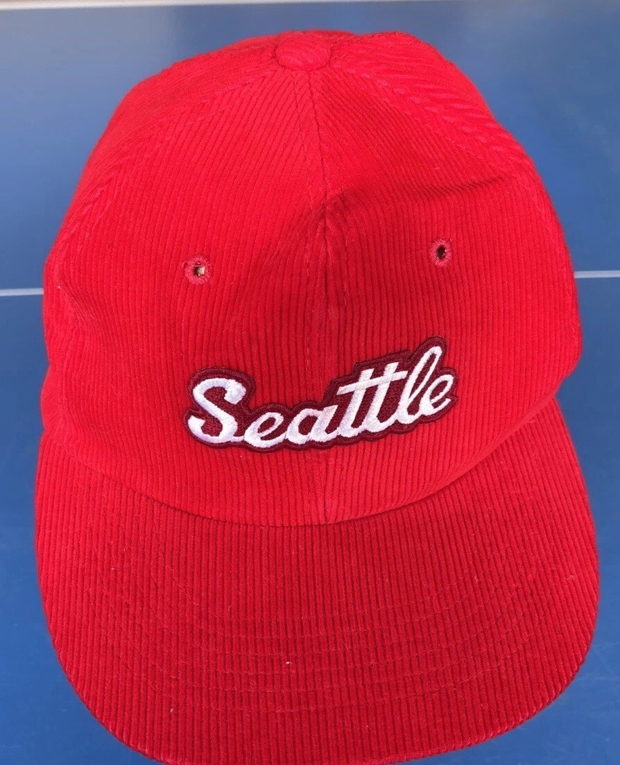 - Vintage Seattle Hat Cap Snap Back Corduroy Script Spell Out Trucker red sam jung
