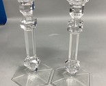 Vintage Signed Val Saint Lambert "Gardenia" Pattern Belgium Crystal Candlesticks. In used but good condition. Has some dried on wax and the glass is spotty but all should come off with a good cleaning. No chips, cracks or scratches. These measure 9.5?H. The base is 4.25?D