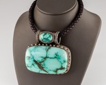 Vintage Native American Sterling Silver 925 Turquoise Statement Pendant Necklace - Large Rectangular Stone, 20-inch Braided Leather Strap