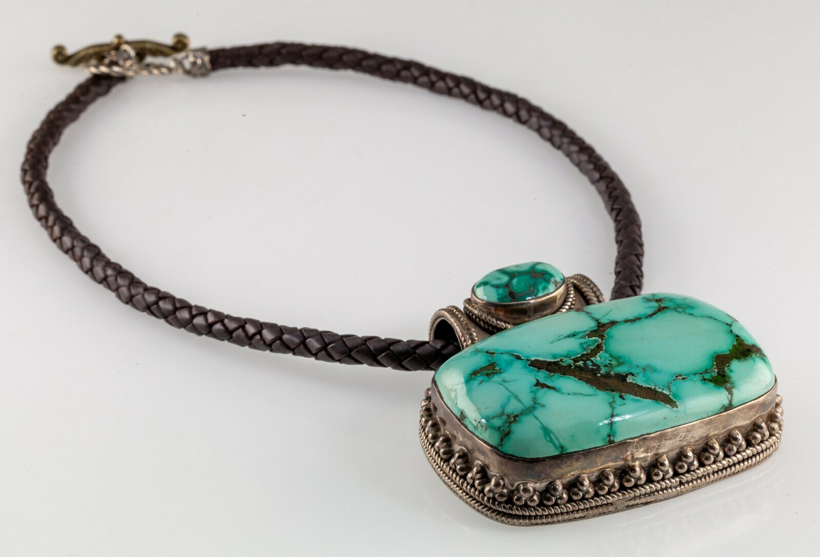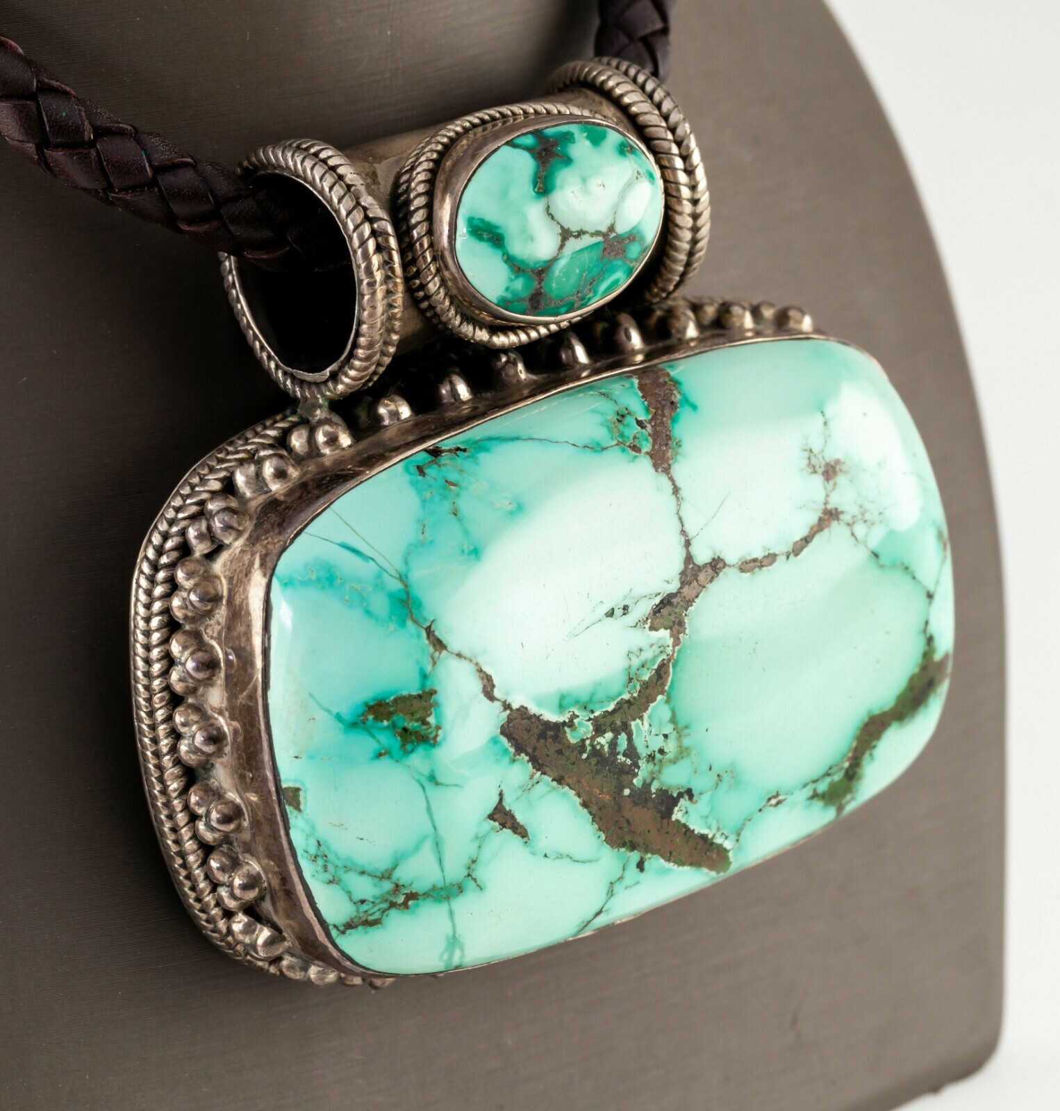 Gorgeous Large Silver Turquoise Pendant on Braided Leather Strap